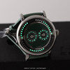 Case: Brushed & polished stainless steel case. Green main dial. Dual raised black & green sub-dials. Fixed position metal indicators with rotating hour & minute discs. Jumping-hour sub-dial at 9 o'clock with luminous numbers. Minutes sub-dial at 3 o'clock with luminous numbers.