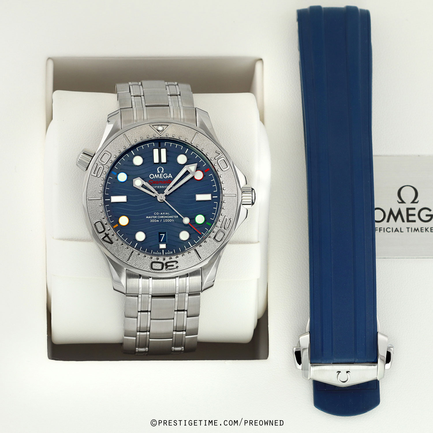 - Delivered with an additional original Omega blue rubber strap with a stainless steel push-button deployant clasp. The strap is in excellent near new condition with the vast majority of its wear lifespan remaining. We would be comfortable grading the strap in 98% condition.