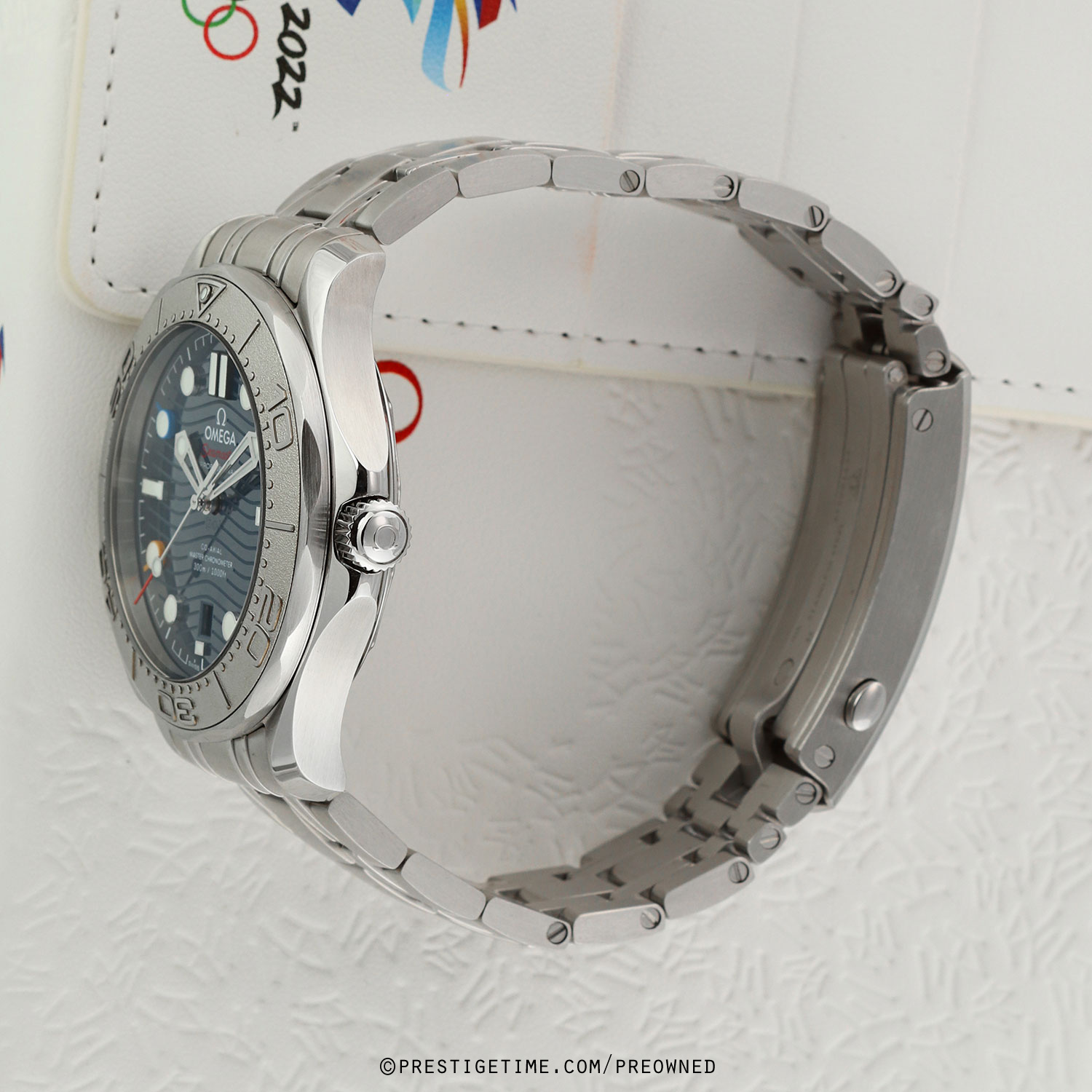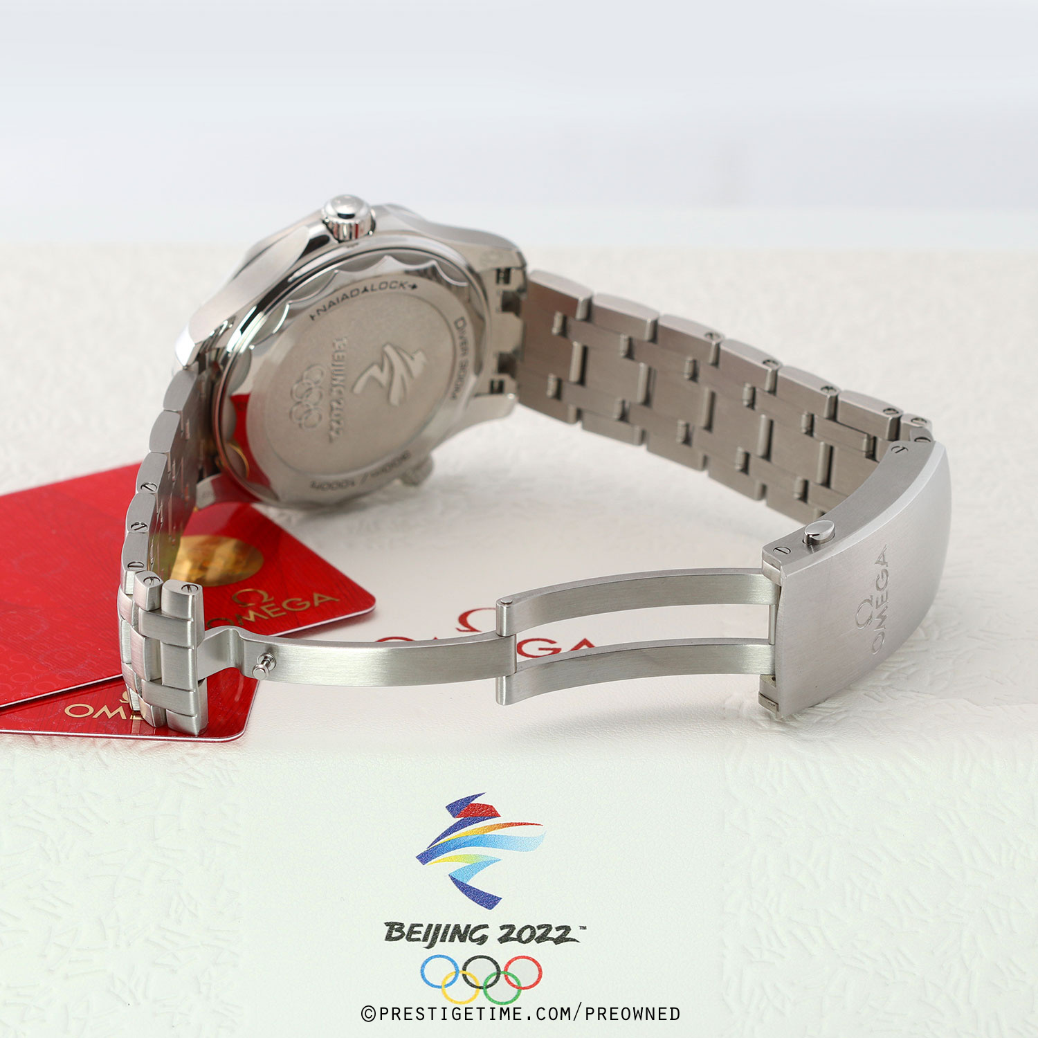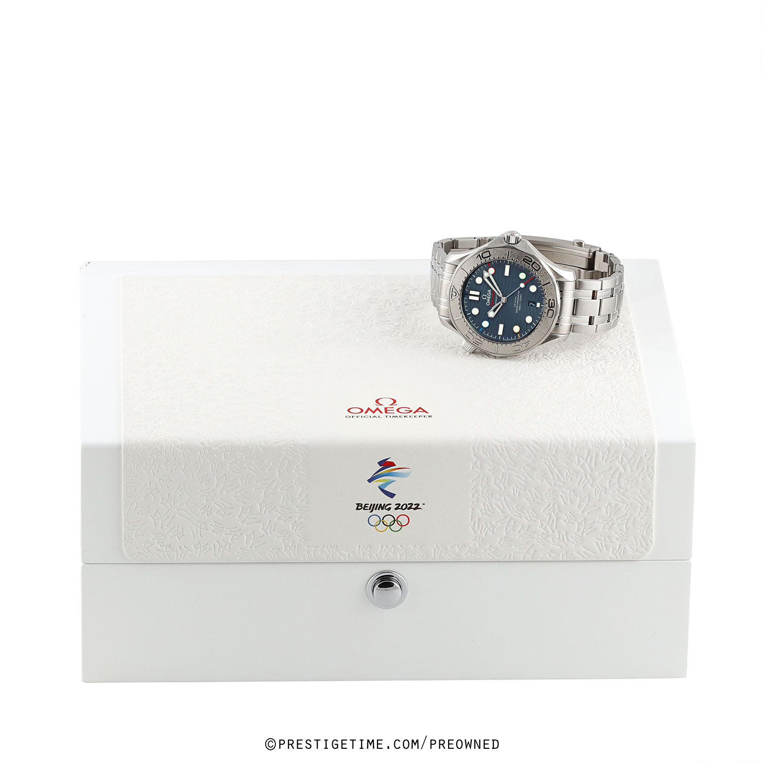 Olympic Winter Games Beijing 2022 special edition. Features a grade-5 titanium bezel & solid case back with an embossed Beijing 2022 Olympics logo. The dial features black (12), red (2), green (4), yellow (8) & blue (10) hour markers, the colors of the Olympic Rings. Delivered in a special presentation box.