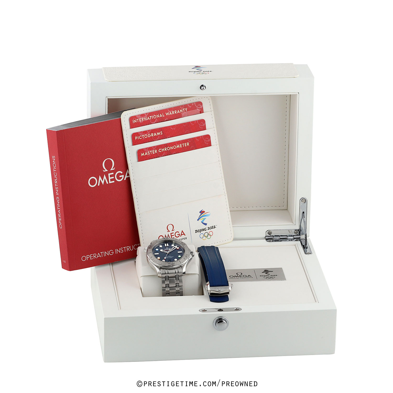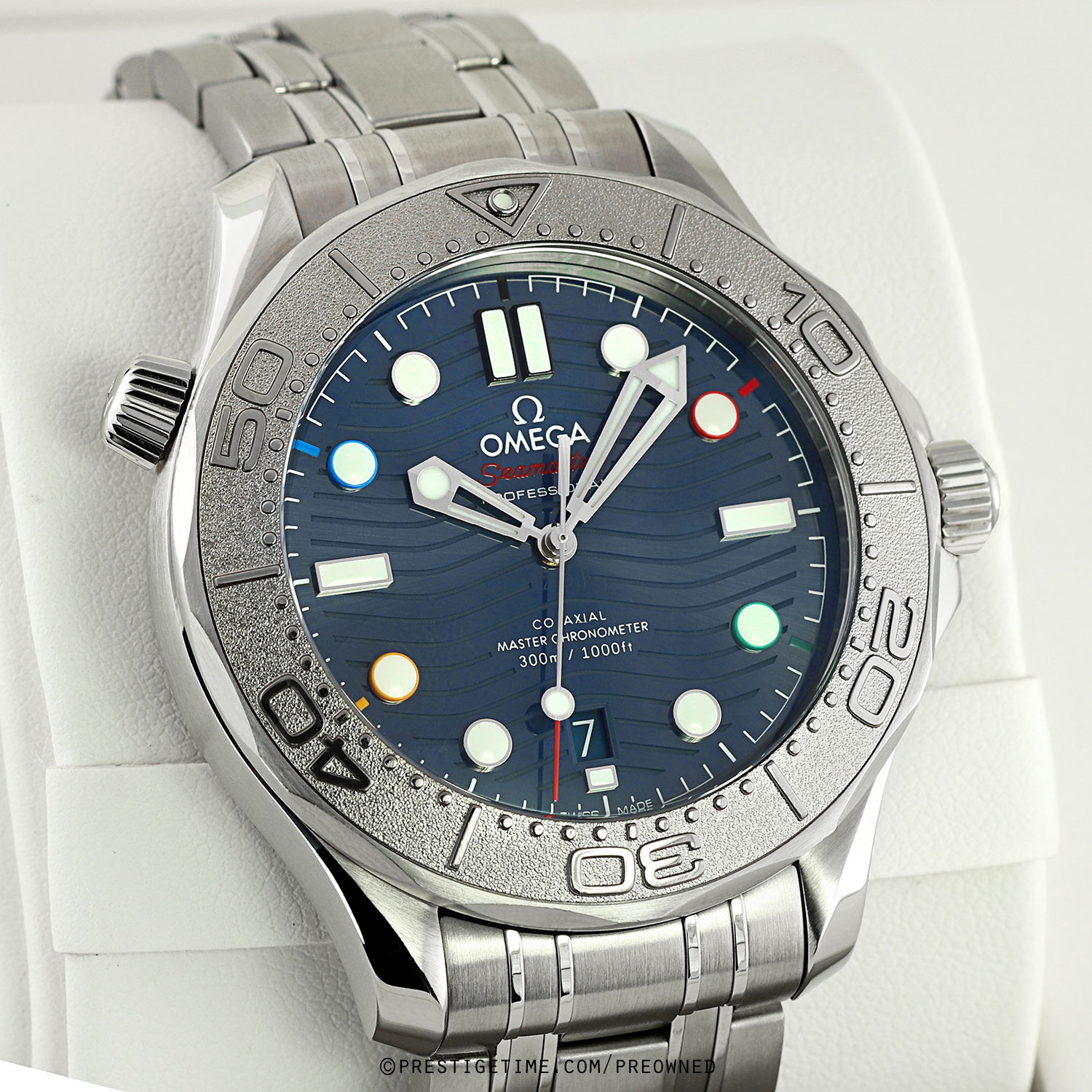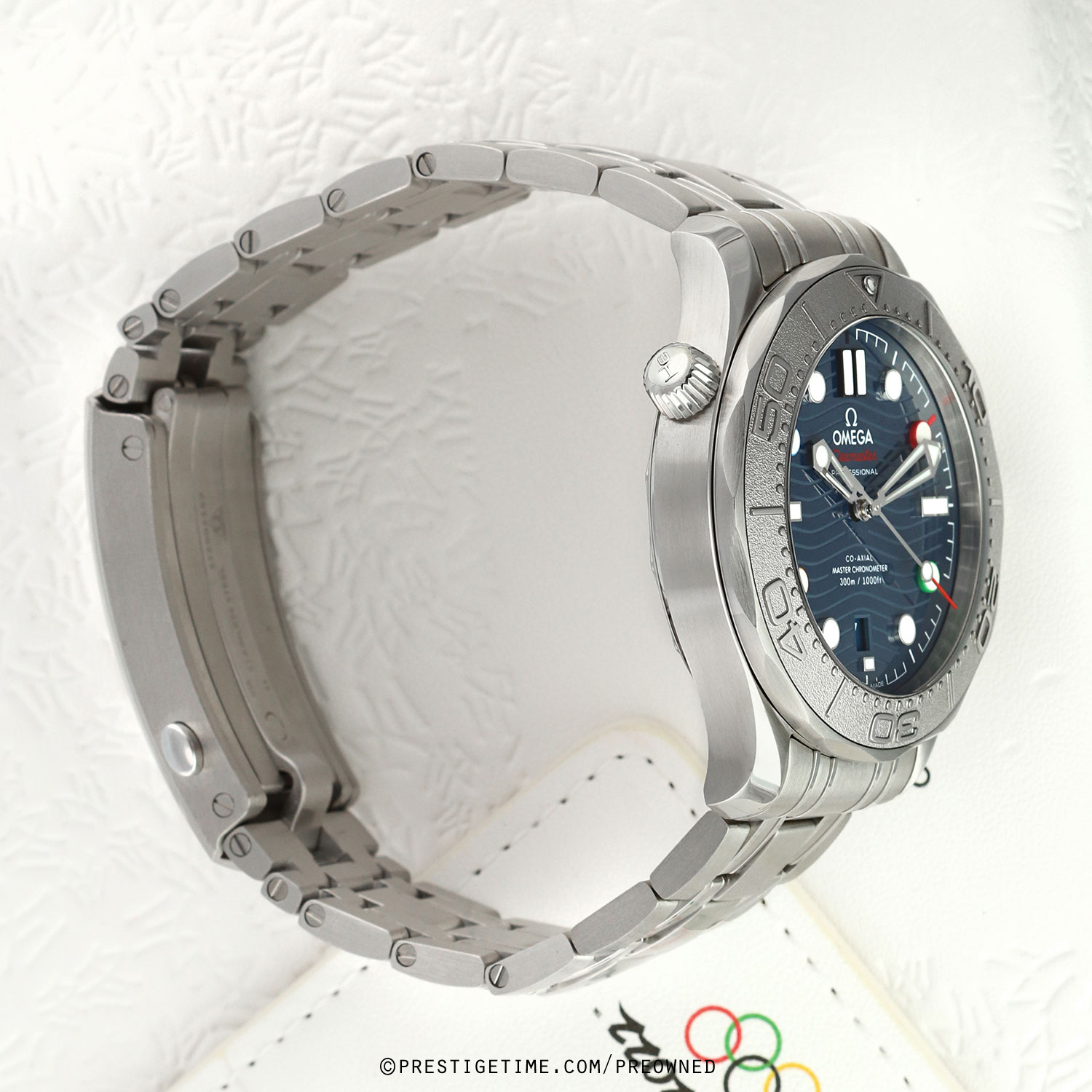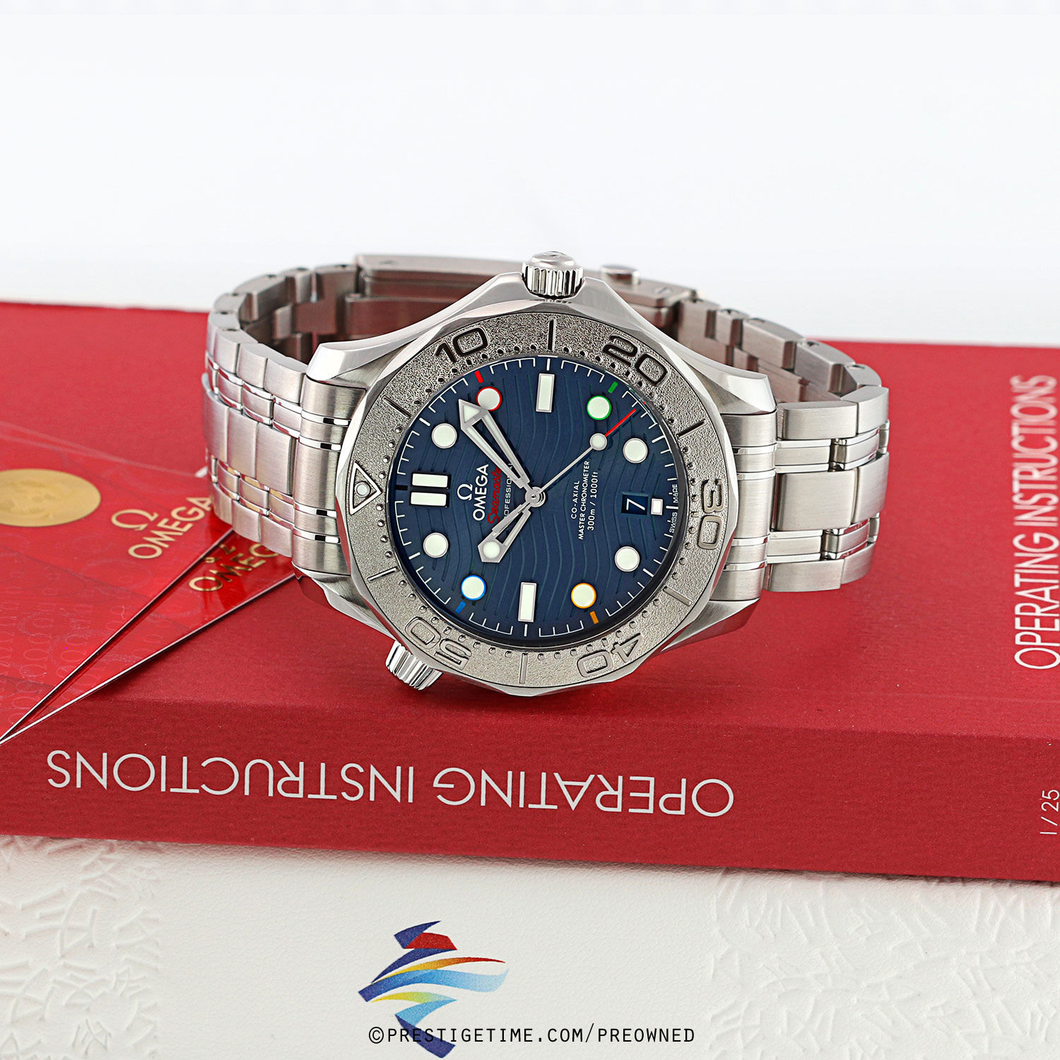 Olympic Winter Games Beijing 2022 special edition. Features a grade-5 titanium bezel & solid case back with an embossed Beijing 2022 Olympics logo. The dial features black (12), red (2), green (4), yellow (8) & blue (10) hour markers, the colors of the Olympic Rings. Delivered in a special presentation box.