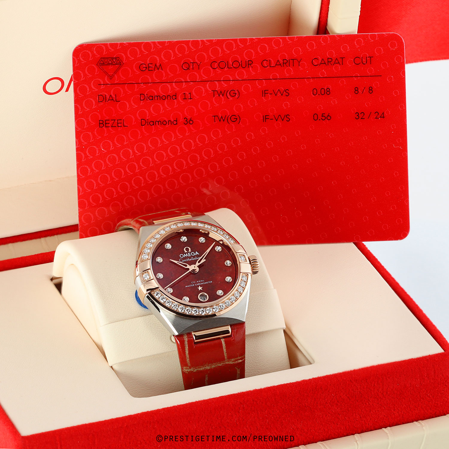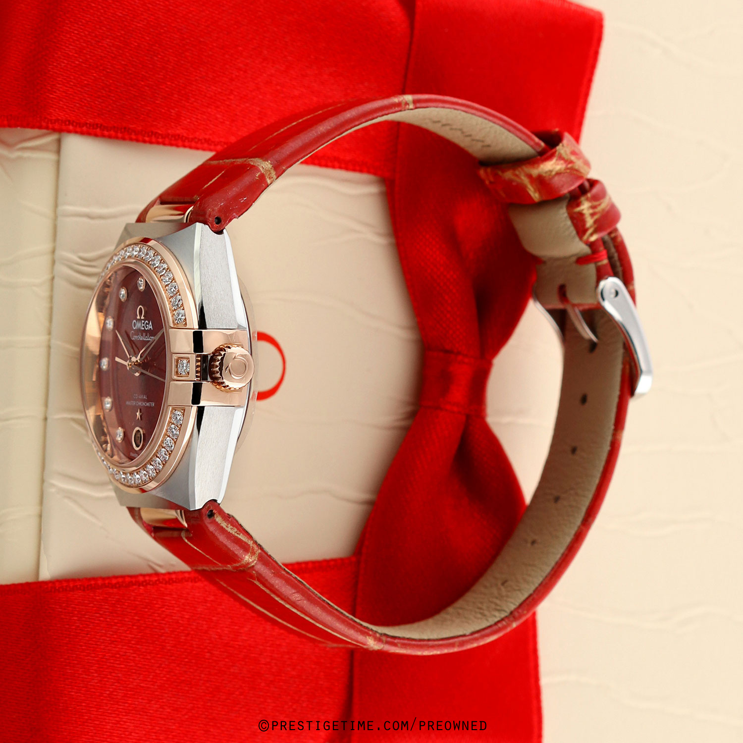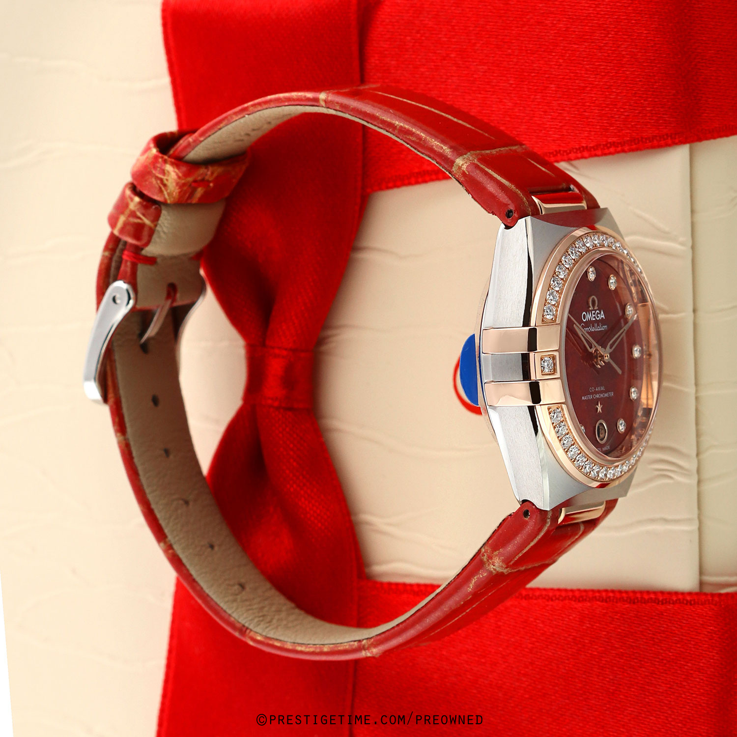 Strap: Presented on its original Omega red-orange alligator strap, highlighted by golden tone accents within the creases to echo the tones of the dial, and with a stainless steel tang buckle. The strap is unworn, in brand new condition with its full wear-lifespan remaining.