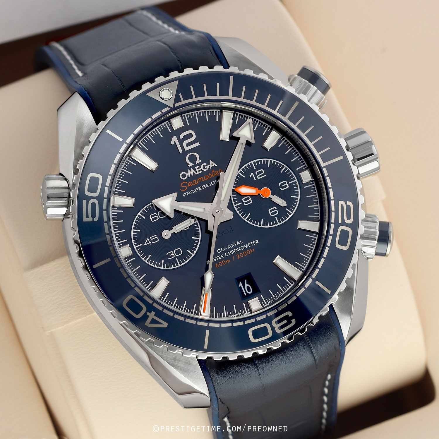 - 60 minute (orange hand) & 12 (polished hand) hour counters are combined into a single sub-dial at 3 o'clock.