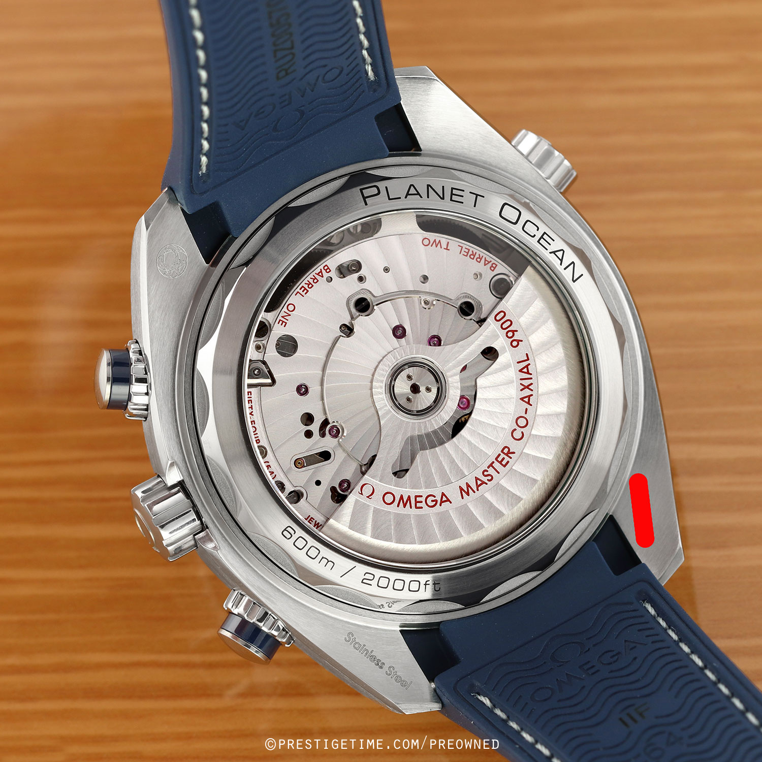 Movement: Powered by a self-winding METAS certified Omega caliber 9900, beats at 25,200 vph (3.5Hz), contains 54 jewels & has an approximate power reserve of 60 hours. The METAS certification tests water resistance, precision and magnetic resistance up to 15,000 gauss. The movement also features Omega's Si14 silicon balance spring and Omegas Co-Axial escapement. The rotor & visible bridges are decorated with Geneva waves in arabesque.