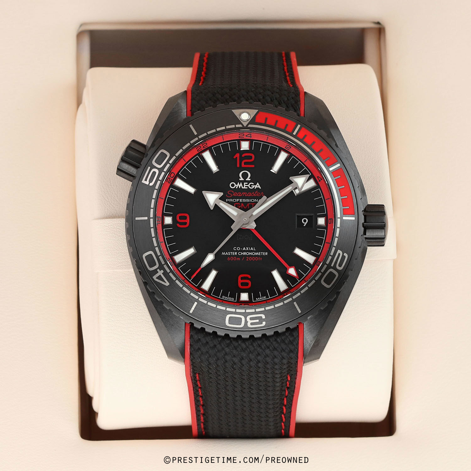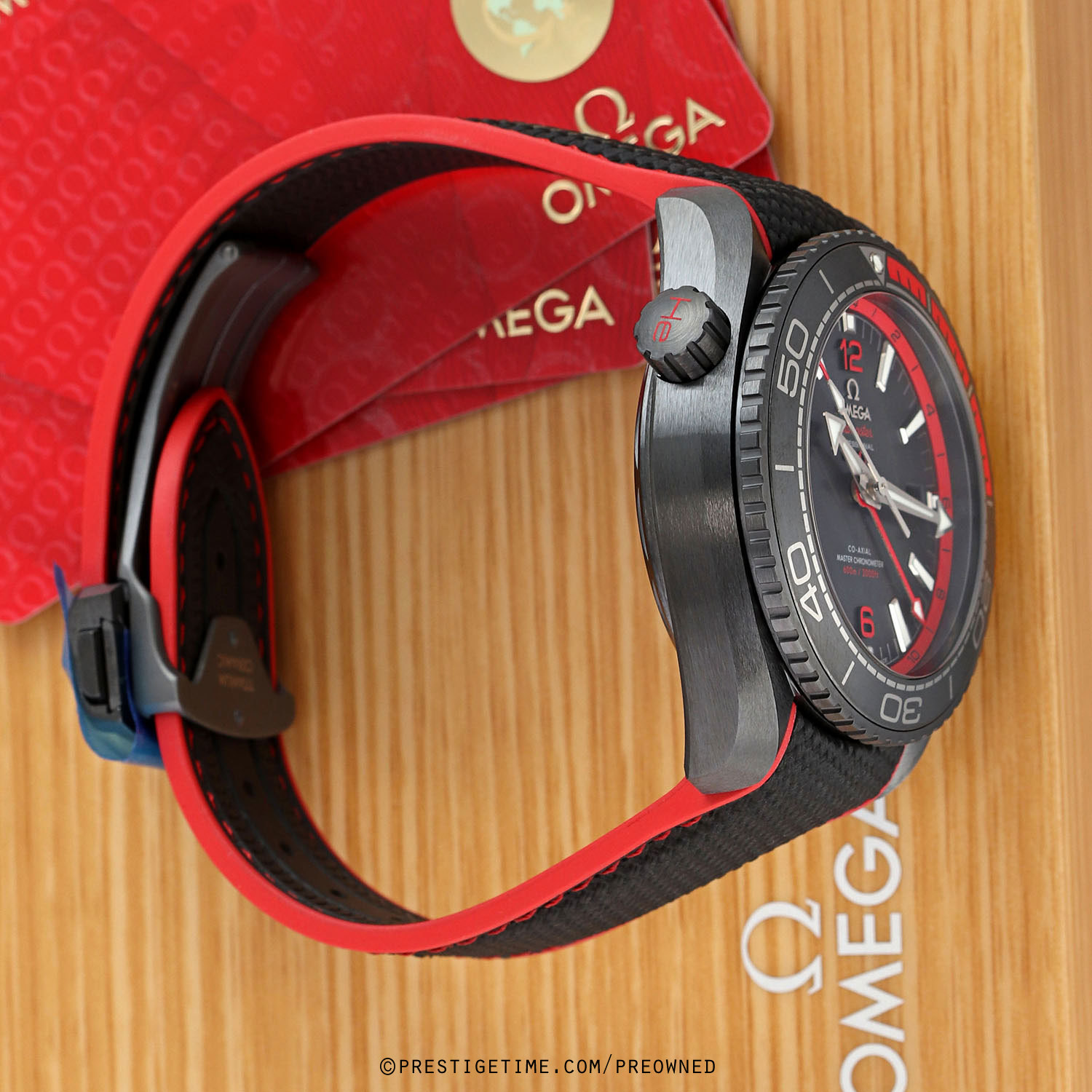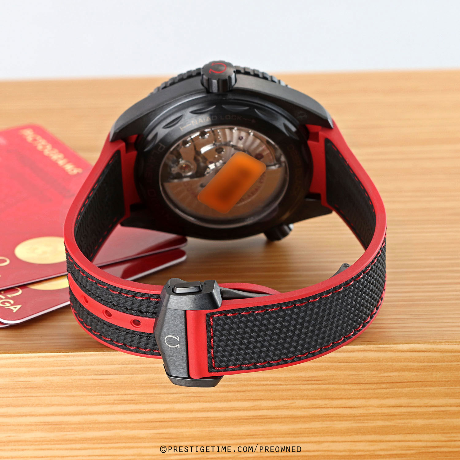 Strap: Fitted on its original black rubber with red stitching & accents and with a black ceramic and titanium push button deployant buckle. The strap is brand new & unworn with its full wear lifespan remaining.