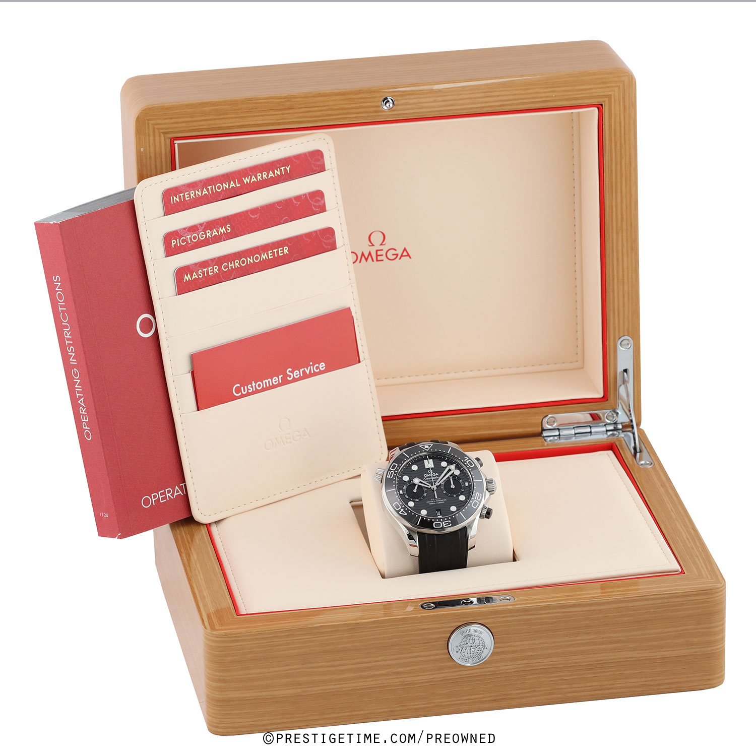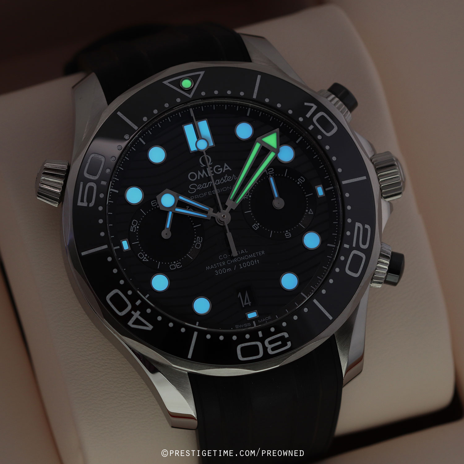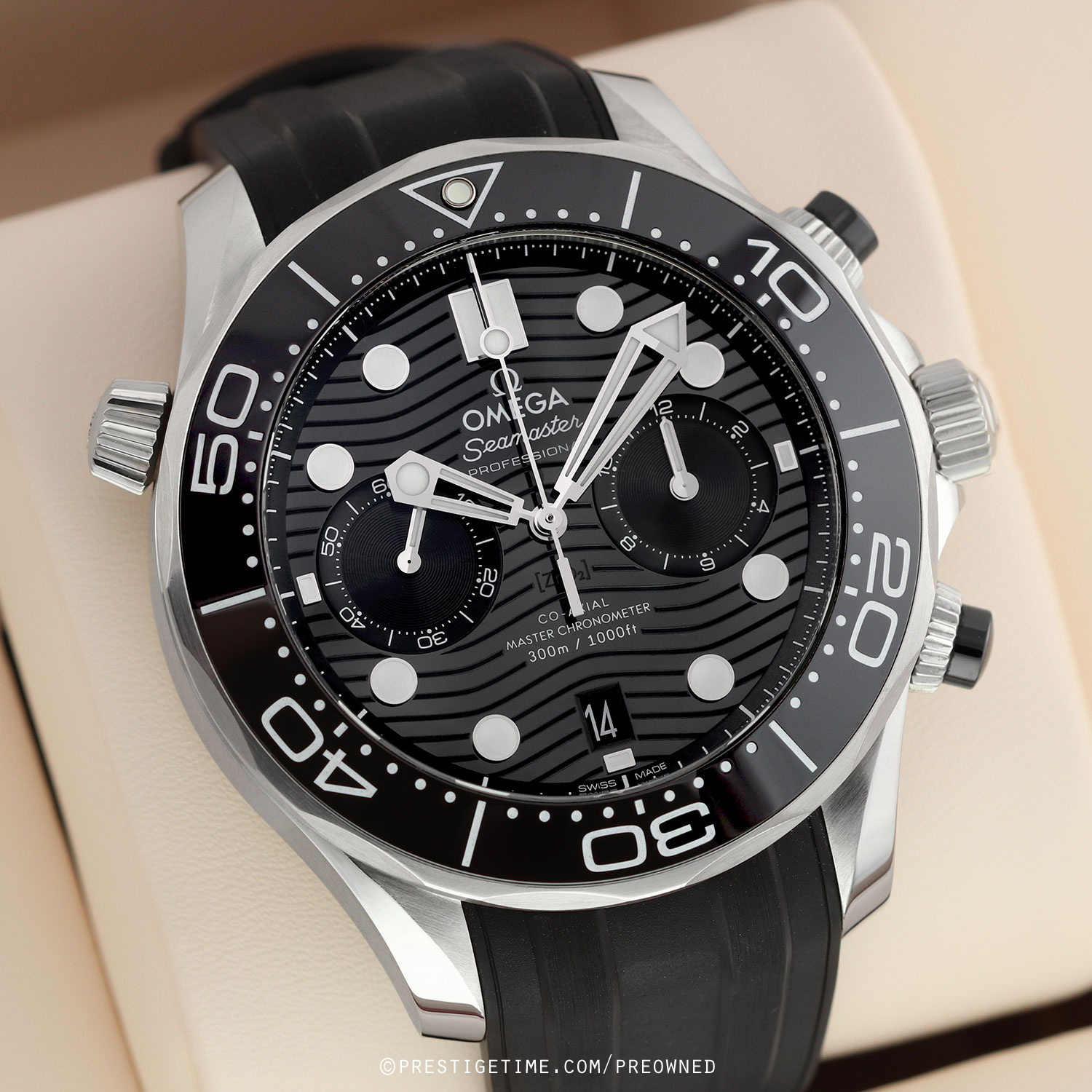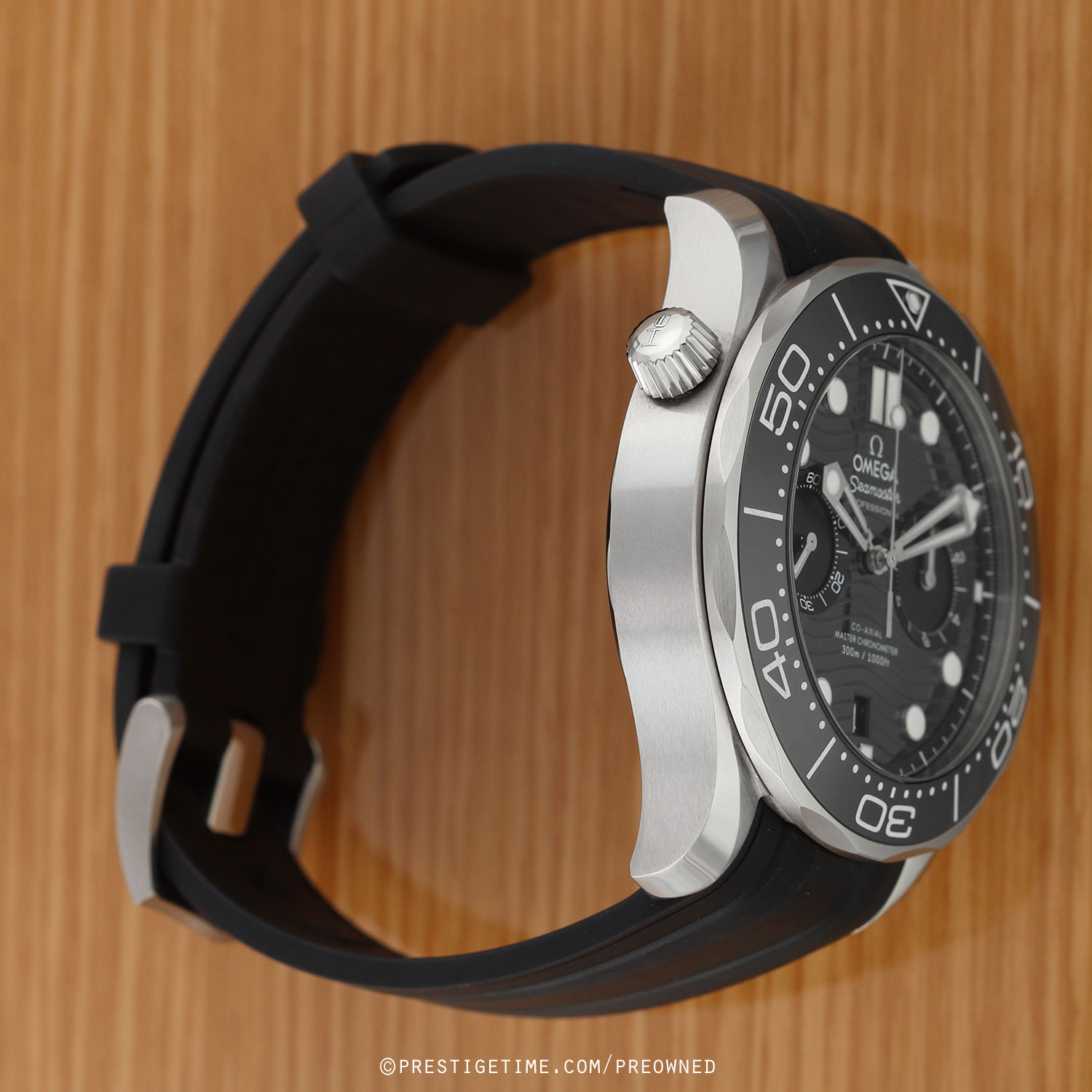 Strap: Fitted on a new Omega original black rubber strap with a stainless steel tang buckle. The strap is unworn, in brand new condition with its full wear lifespan remaining.