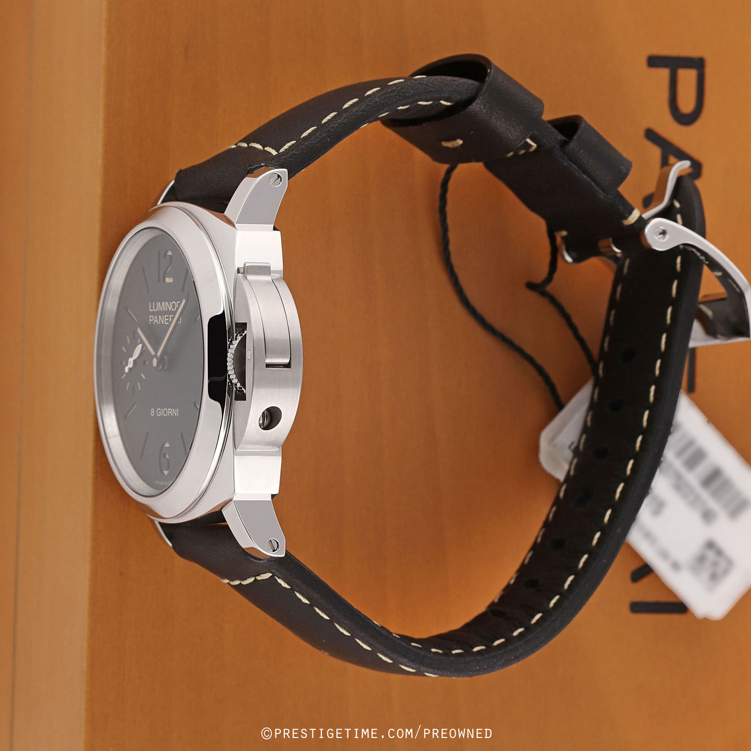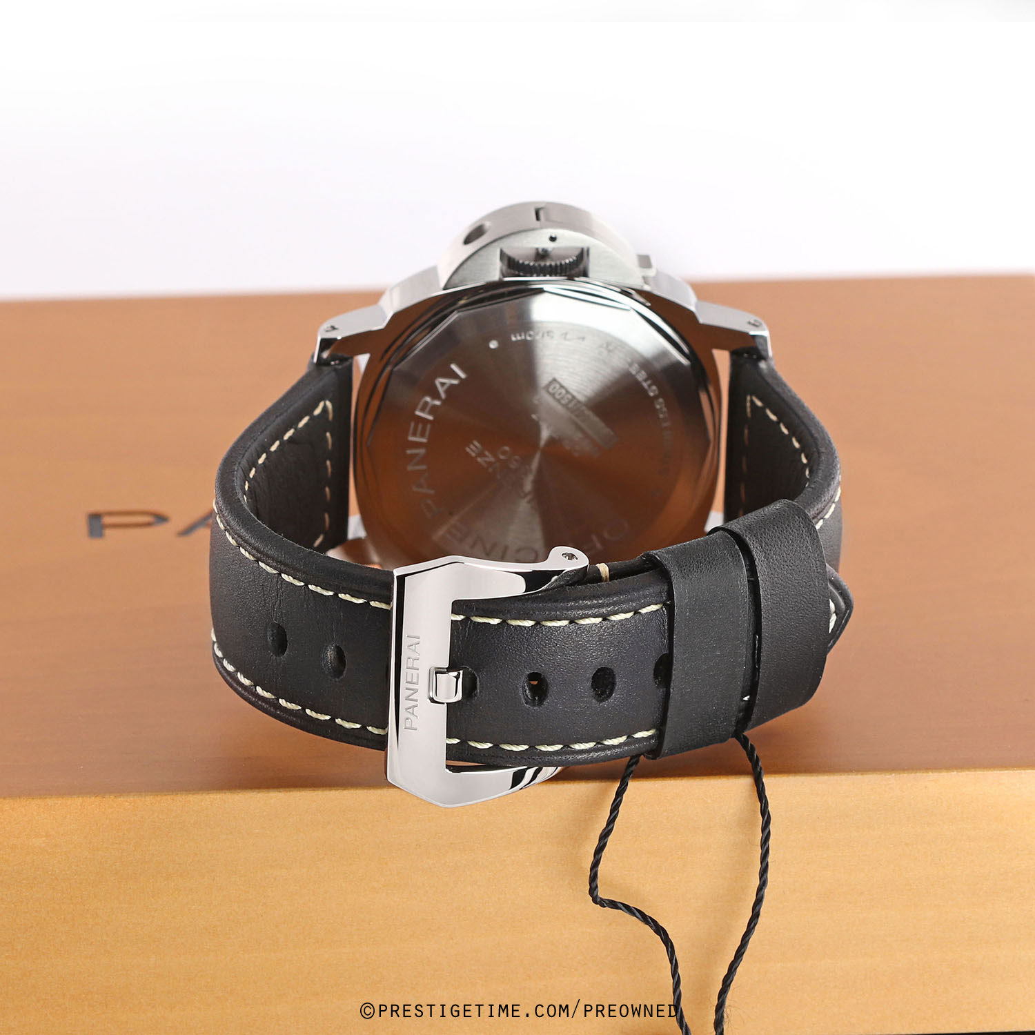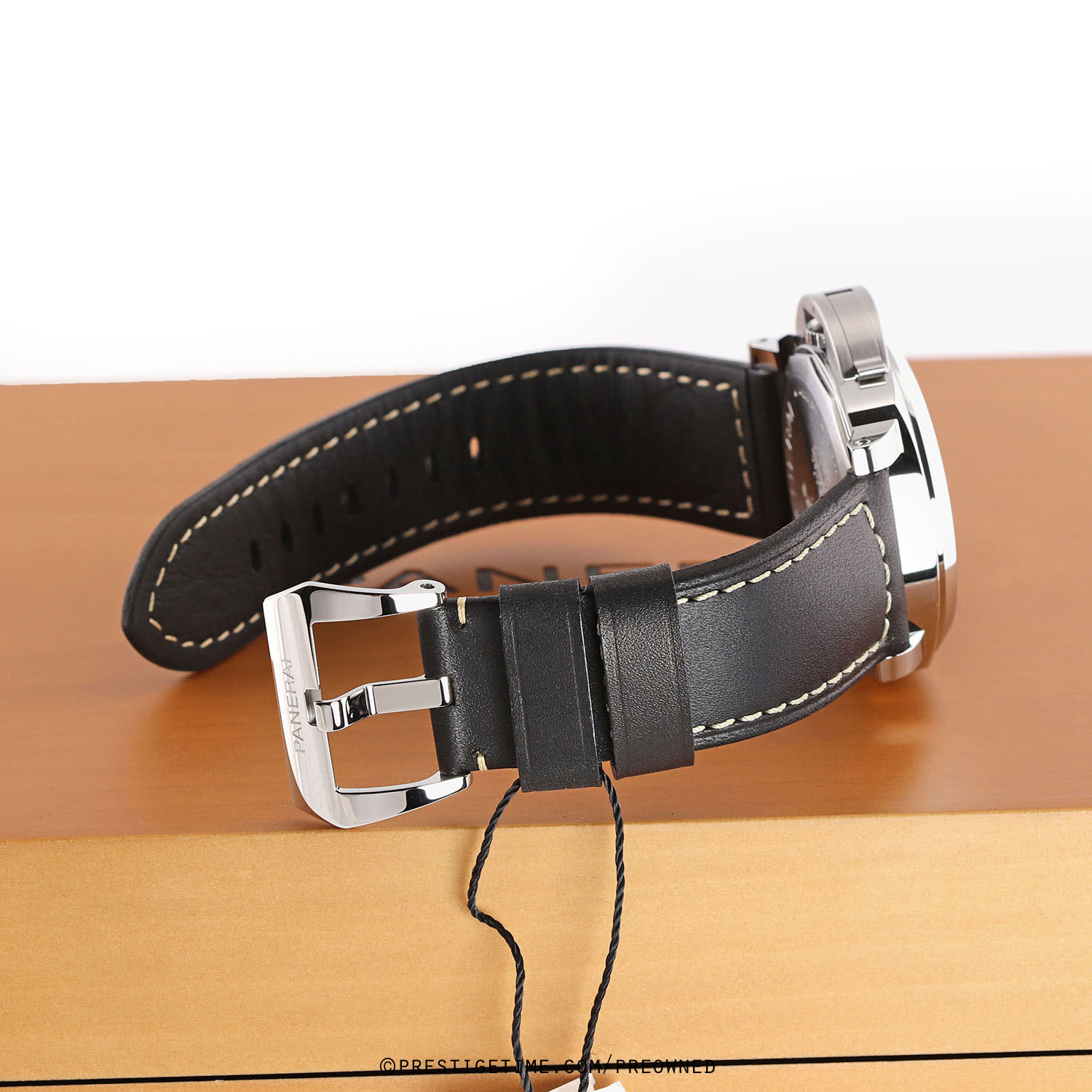 - Fitted on its original Panerai black calfskin leather strap with a stainless steel tang buckle. This strap is unworn, in new condition with its full wear lifespan remaining.