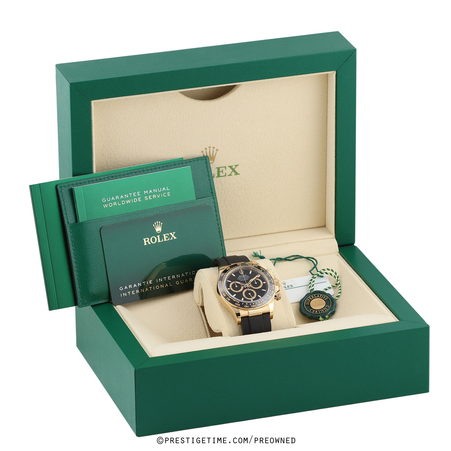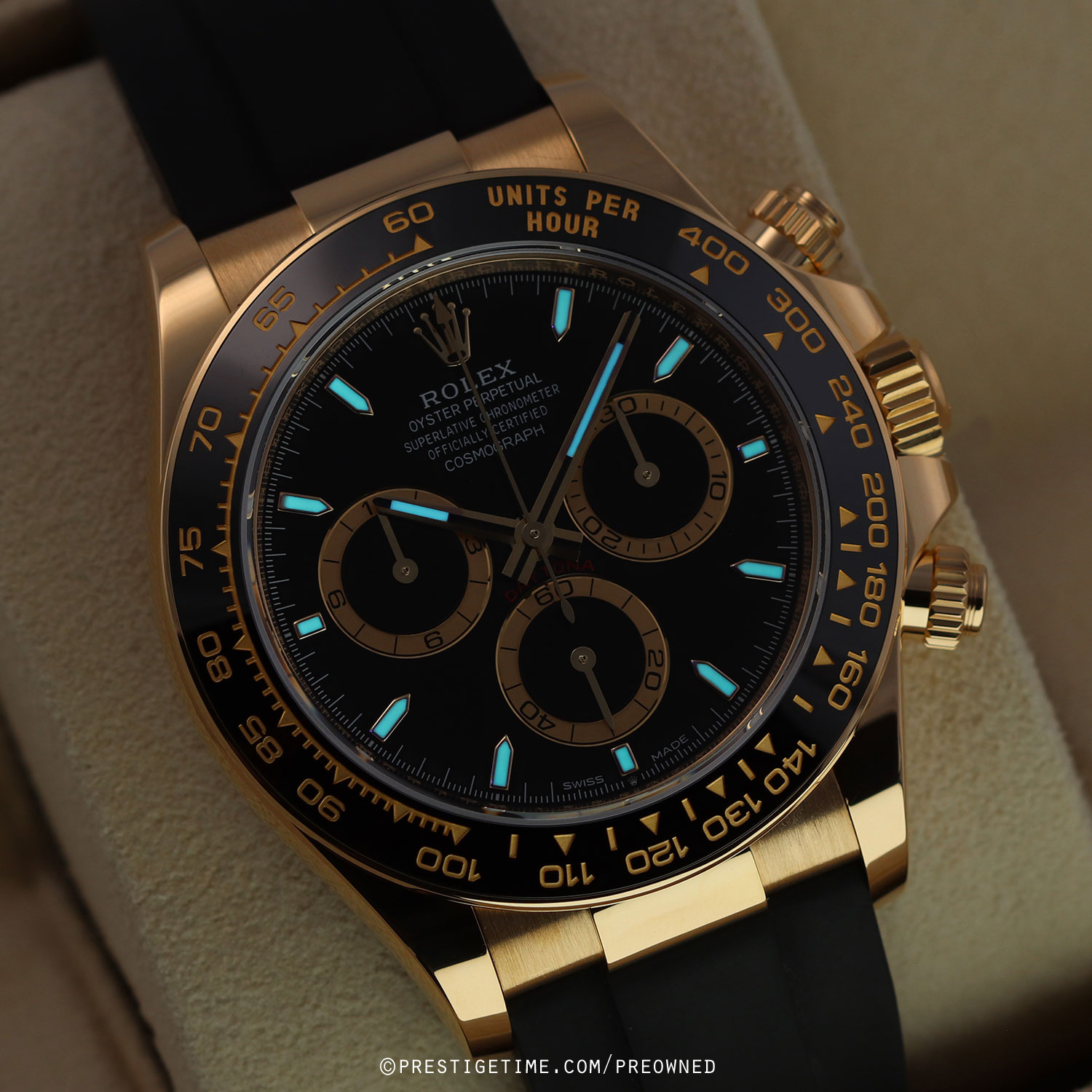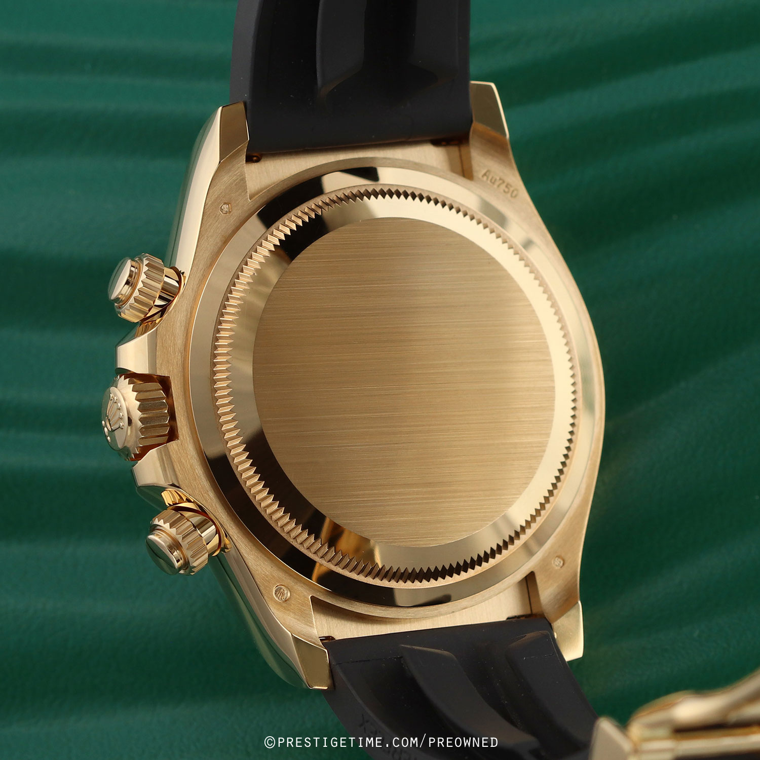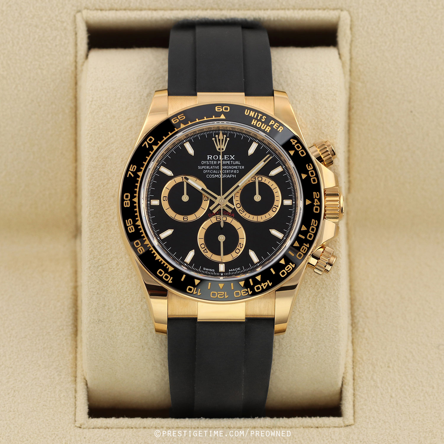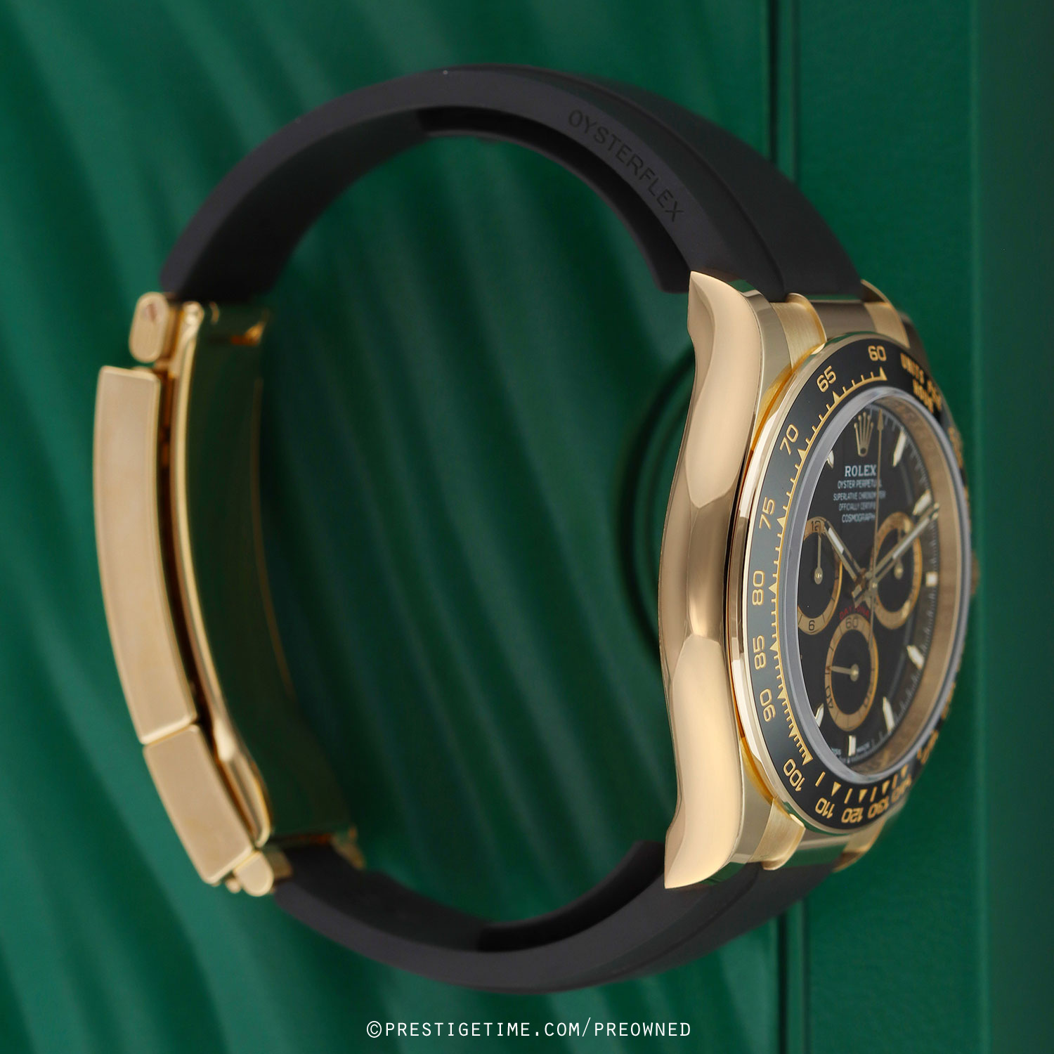 Strap: Fitted on its original Rolex Oysterflex strap, constructed of flexible metal blades overmoulded with high-performance elastomer. Features a solid 18kt yellow gold folding Oysterlock safety clasp with a Glidelock Extension System.