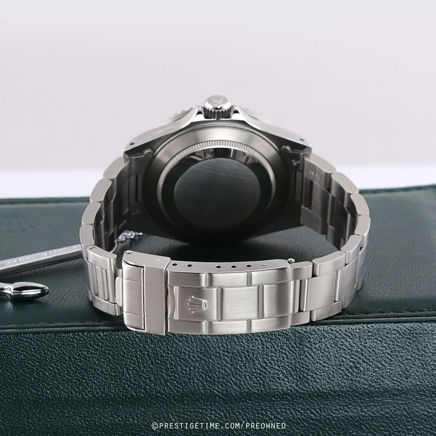 Rolex factory service completed on 3/31/2023 with a 2 year factory service warranty expires 3/31/2025. As part of the factory service the crown, crystal & black aluminum bezel insert have been replaced.