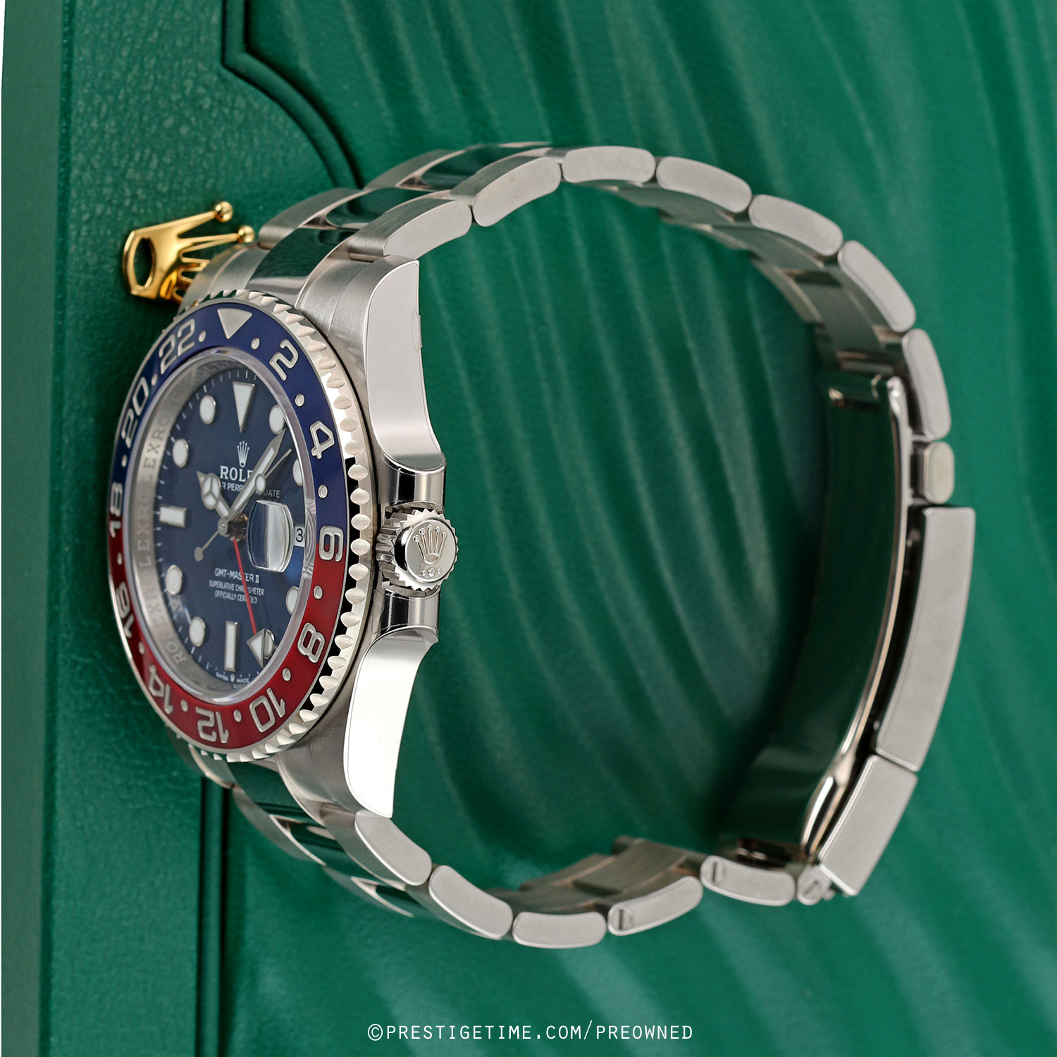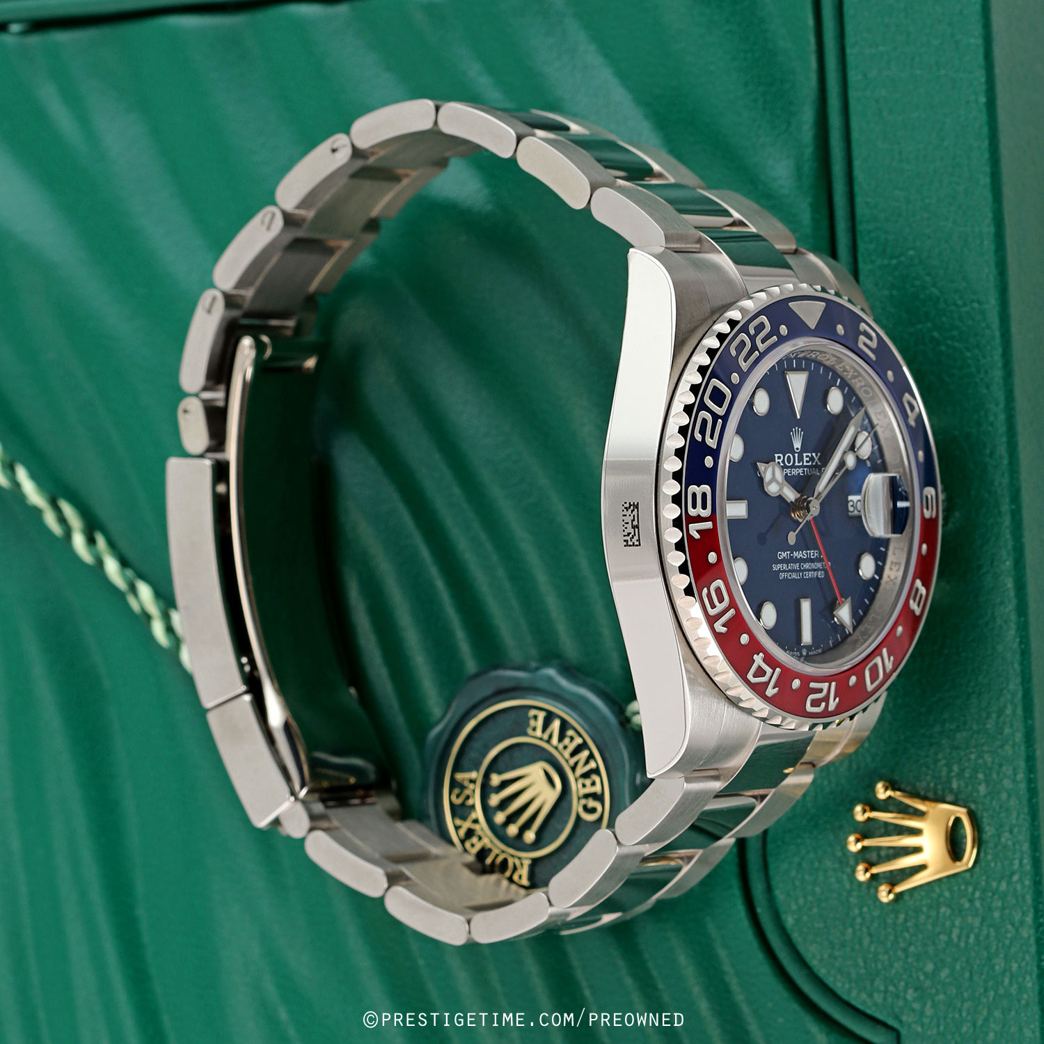 Case: Brushed & polished solid 18kt white gold case. Polished 18kt white gold triplock screw-down crown. 18kt white gold bi-directional rotating bezel with a PEPSI blue & red Cerachrom ceramic bezel insert featuring 24 hour markings. Deep blue dial. Polished white gold hands with luminous fill. Applied white gold polished hour markers with luminous fill. Date window at 3 o'clock with Cyclops magnifier.