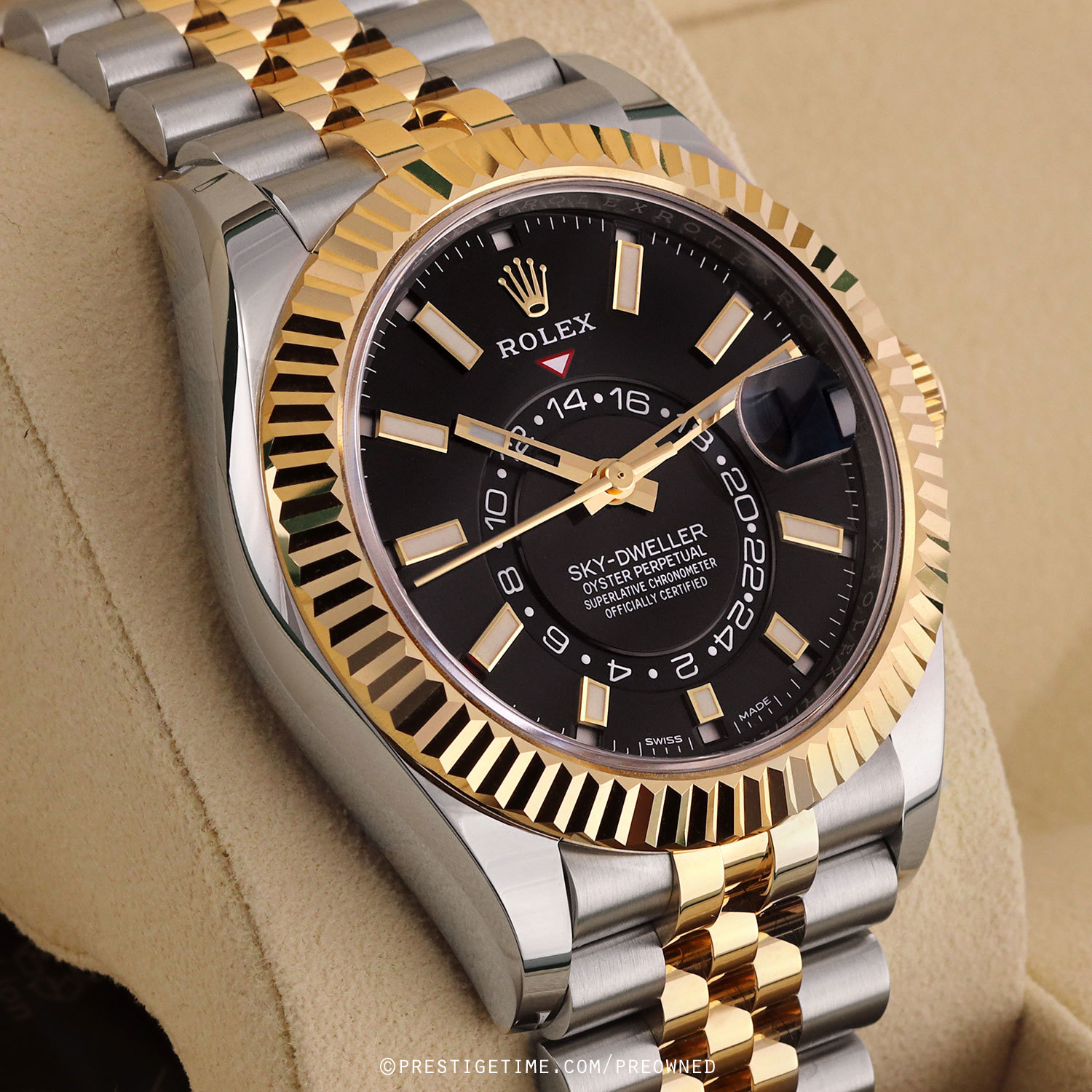 Case: Polished stainless steel case. Polished 18kt yellow gold fluted bezel & Twinlock screw-down crown. Black dial. Applied yellow gold index hour markers with luminous fill. Printed minute/seconds track on the dial perimeter. Polished yellow gold hands. Partially skeletonized minute & hour hands so not to obscure the dual time. Hour & minute hands with luminous filled tips. Features: