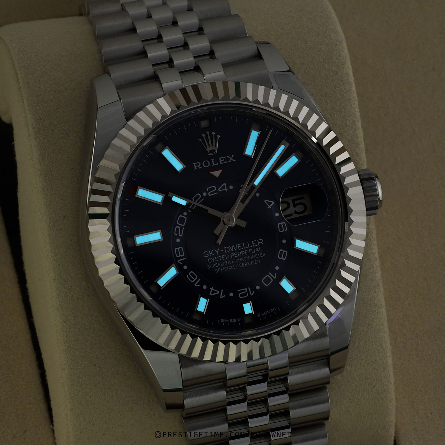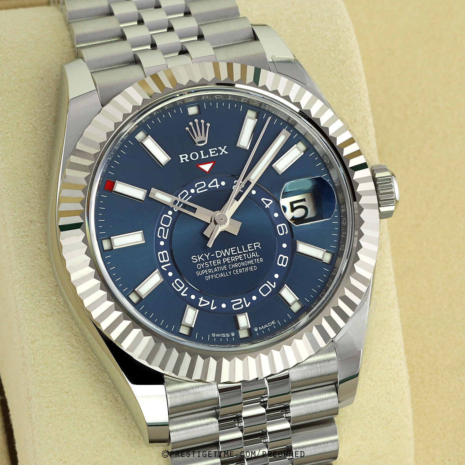 Case: Polished stainless steel case & Twinlock screw-down crown. Polished 18kt white gold fluted bezel. Blue dial. Polished hands. Partially skeletonized minute & hour hands so not to obscure the dual time. Hour & minute hands with luminous filled tips. Applied white gold index hour markers with luminous fill. Printed minute/seconds track on the dial perimeter. Features: