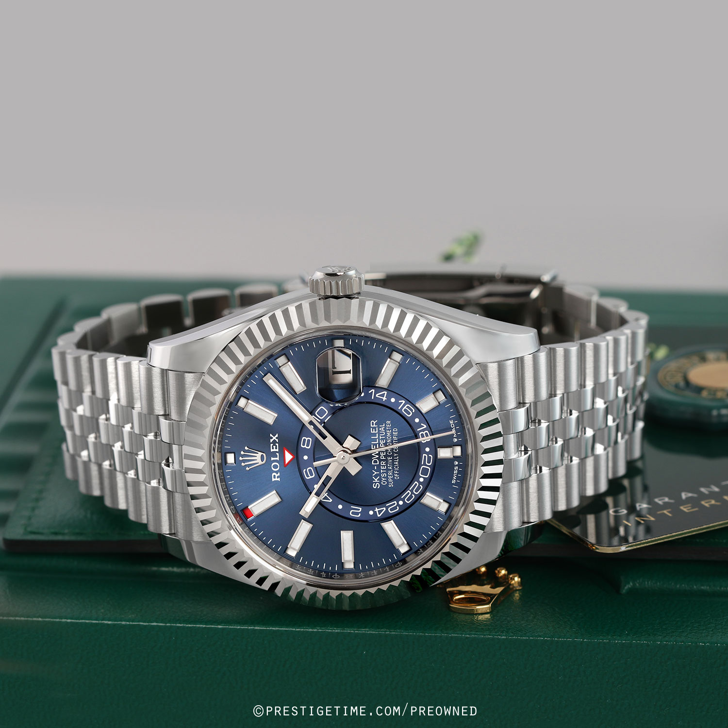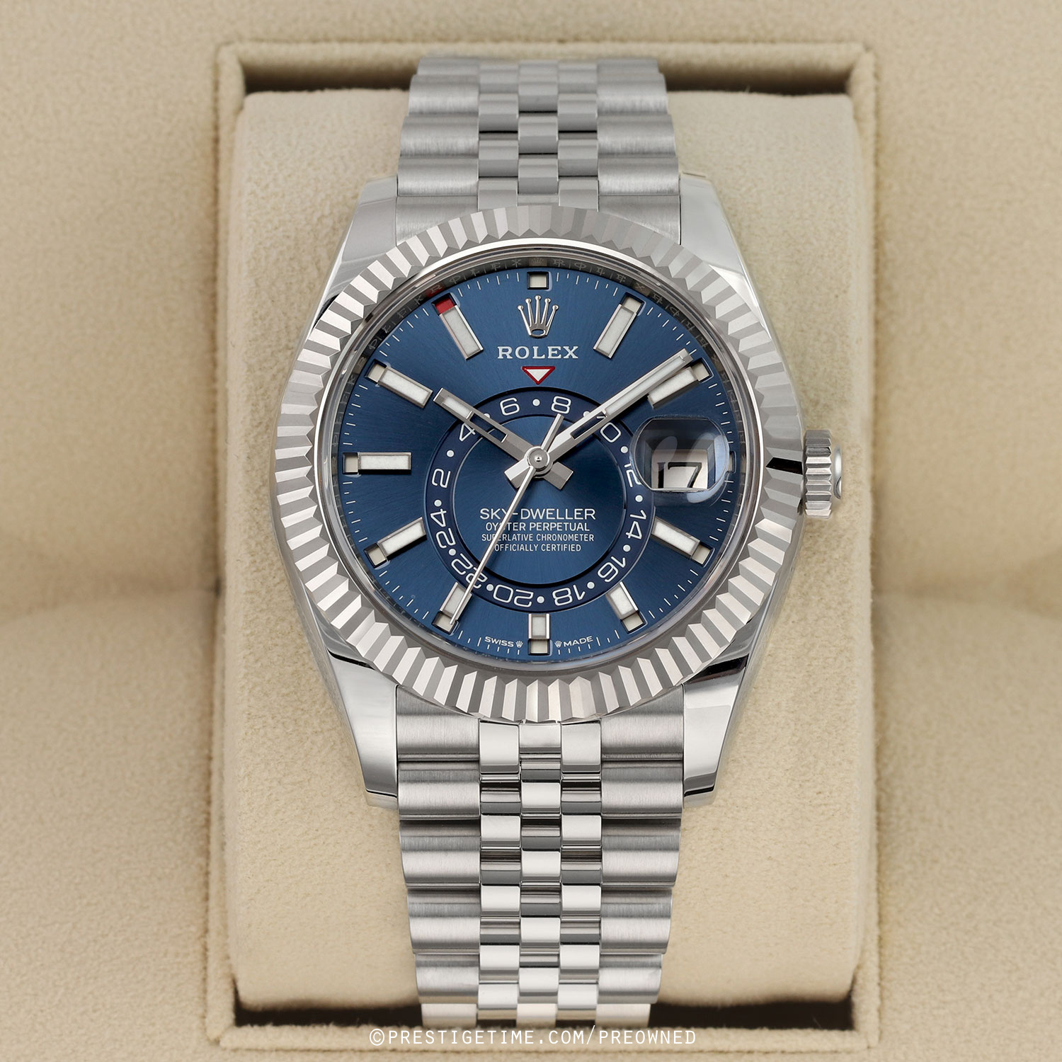 Case: Polished stainless steel case & Twinlock screw-down crown. Polished 18kt white gold fluted bezel. Blue dial. Polished hands. Partially skeletonized minute & hour hands so not to obscure the dual time. Hour & minute hands with luminous filled tips. Applied white gold index hour markers with luminous fill. Printed minute/seconds track on the dial perimeter. Features: