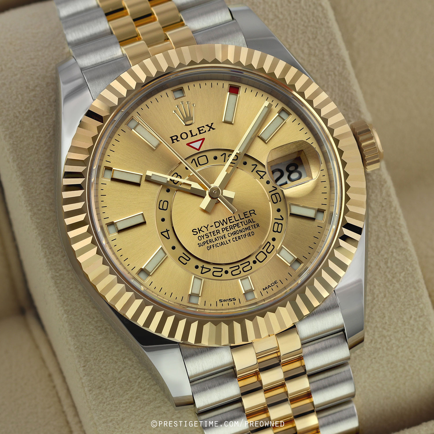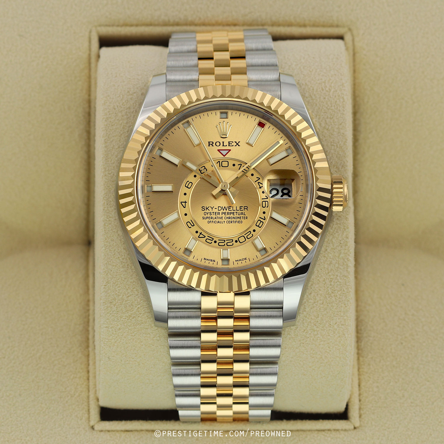 Case: Polished stainless steel case. Polished 18kt yellow gold fluted bezel & Twinlock screw-down crown. Champagne dial. Polished yellow gold hands. Partially skeletonized minute & hour hands so not to obscure the dual time. Hour & minute hands with luminous filled tips. Applied yellow gold index hour markers with luminous fill. Printed minute/seconds track on the dial perimeter. Features: