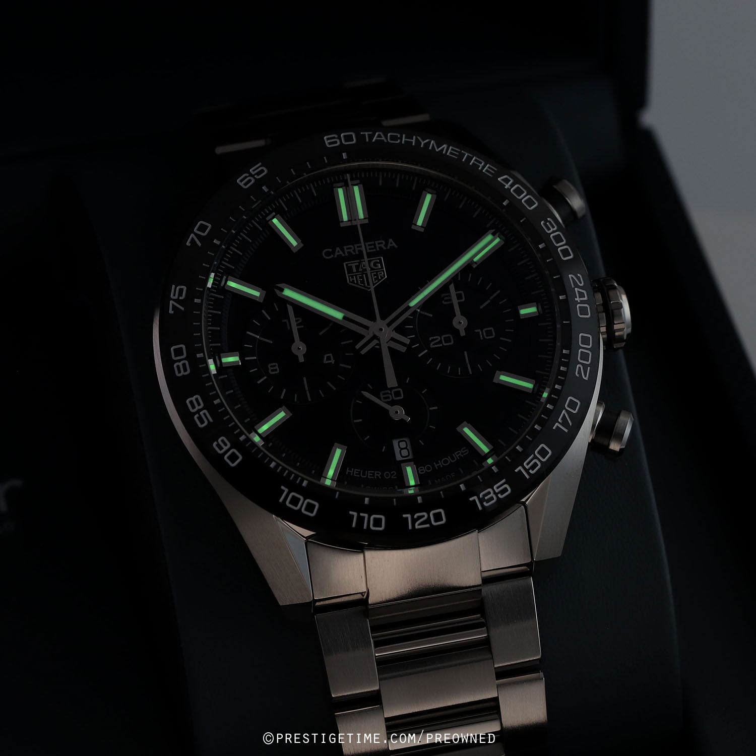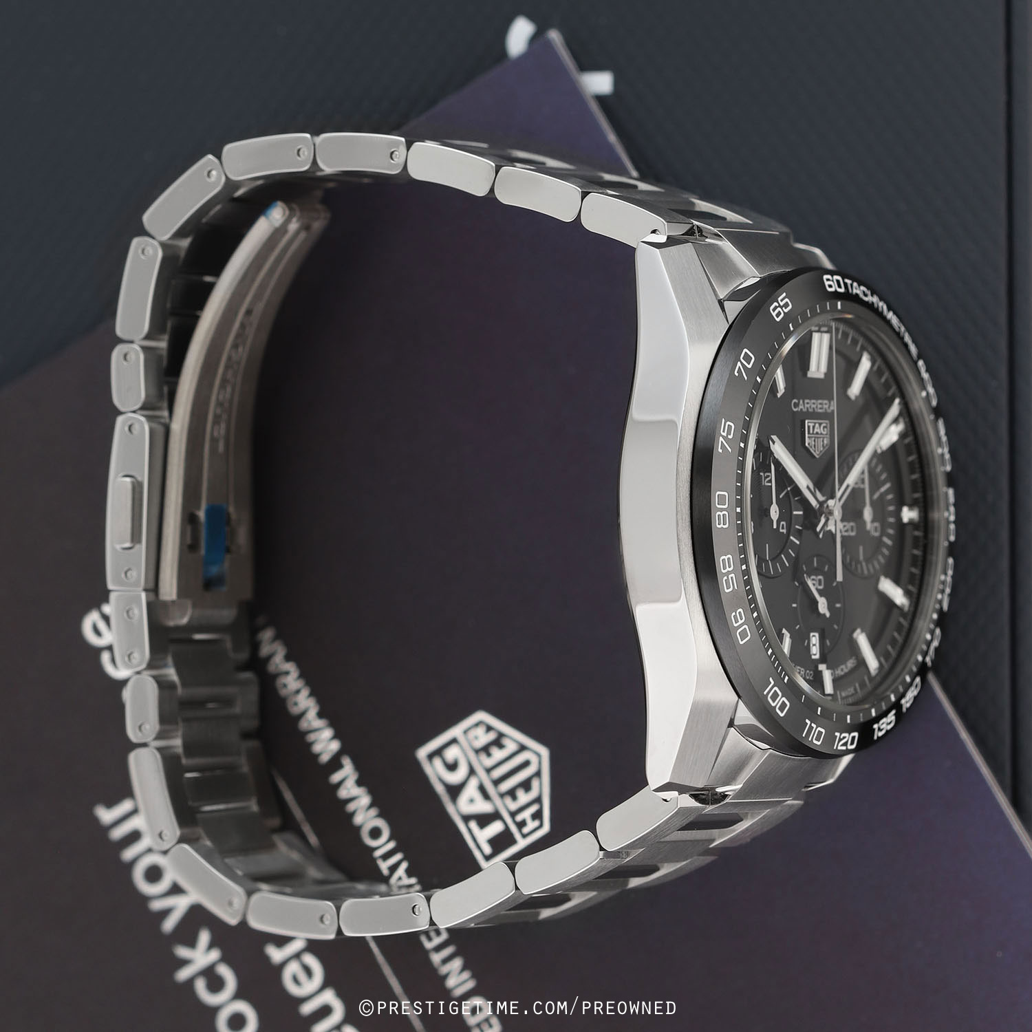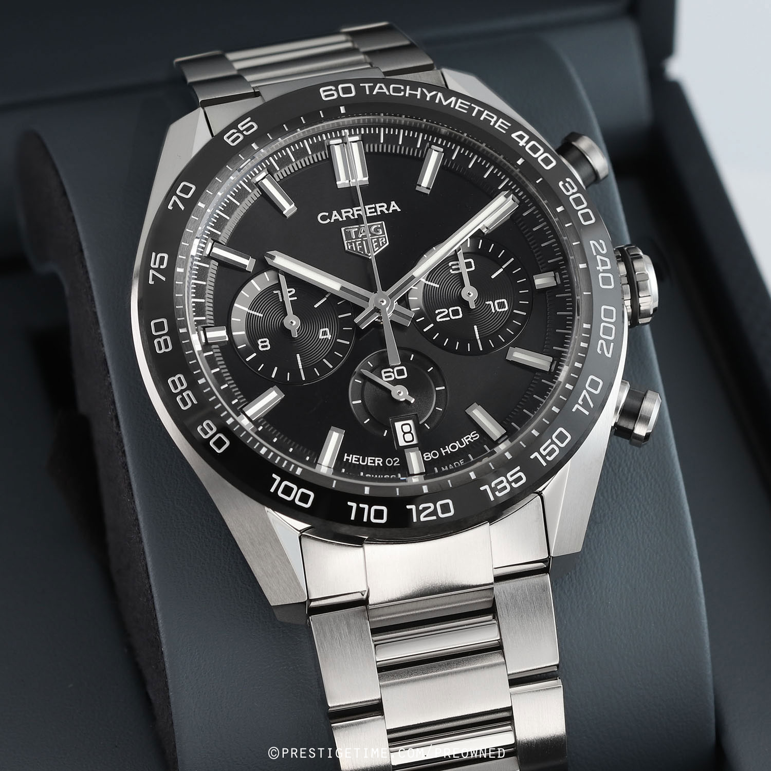 Case: Brushed & polished stainless steel case. Polished black ceramic with bezel with tachymeter scale. Black dial. Polished hands, the hour & minute hands with luminous fill. Applied polished index hour markers with luminous fill. Fine printed minute/seconds & fractions-of-a-seconds track on dial flange. Date window at 6 o'clock. Small seconds sub-dial at 6 o'clock.