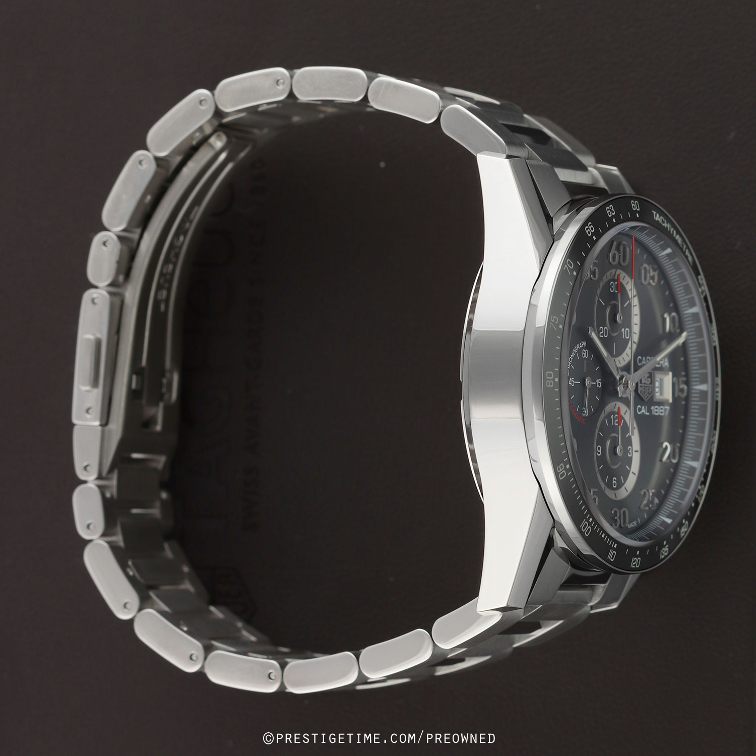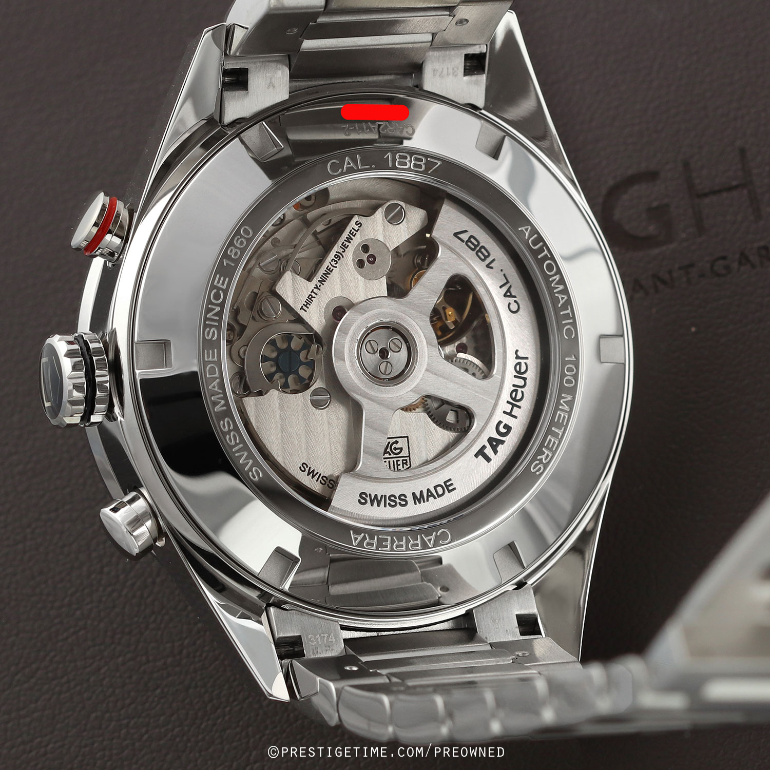 Movement: Powered by a TAG Heuer caliber 1887, beats at 28,800 vph, contains 39 jewels & has a power reserve of +/- 50 or +/- 40 hours when the chronograph is running.