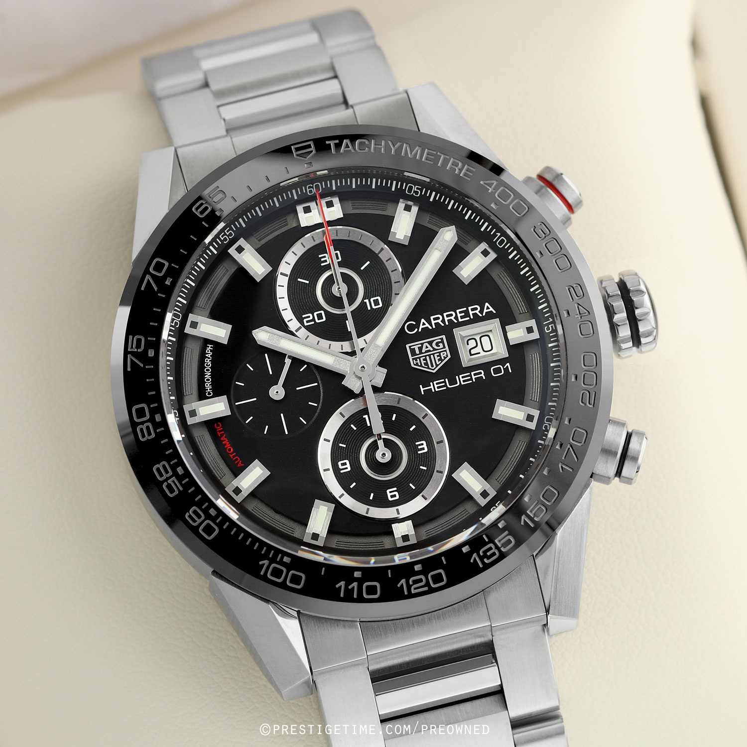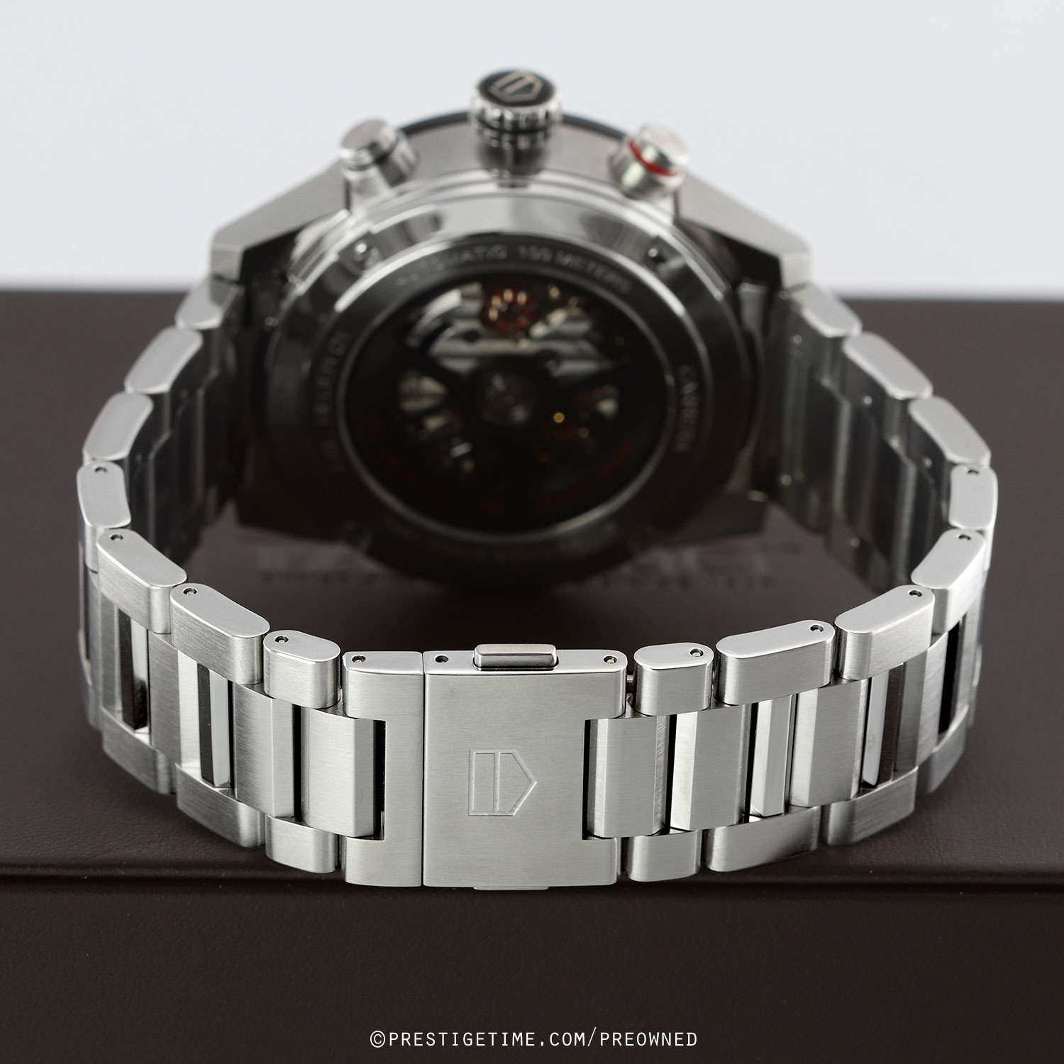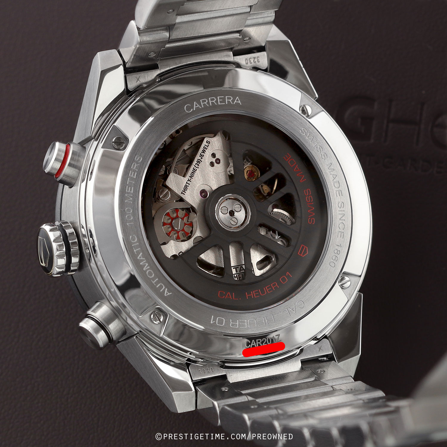 Movement: Powered by a TAG Heuer caliber 01, beats at 28,800 vph (4Hz), contains 39 jewels & has a power reserve of +/-50 hours if just the watch is running or +/- 40 hour if the chronograph function is running.
