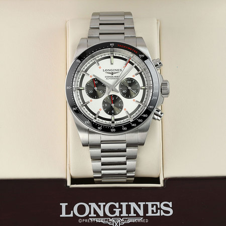 Case: Polished stainless steel case. Black aluminum bezel with Tachymeter scale. Black dial. Polished hands, the hour & minute hands with luminous fill. Applied polished & brushed faceted index hour markers. White printed minutes/seconds track. Black dial flange with luminous hour markers & white printed fractions of a second track. Day & date windows at 3 o'clock. Small seconds sub-dial at 9 o'clock.
