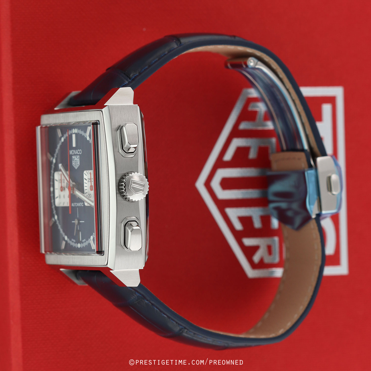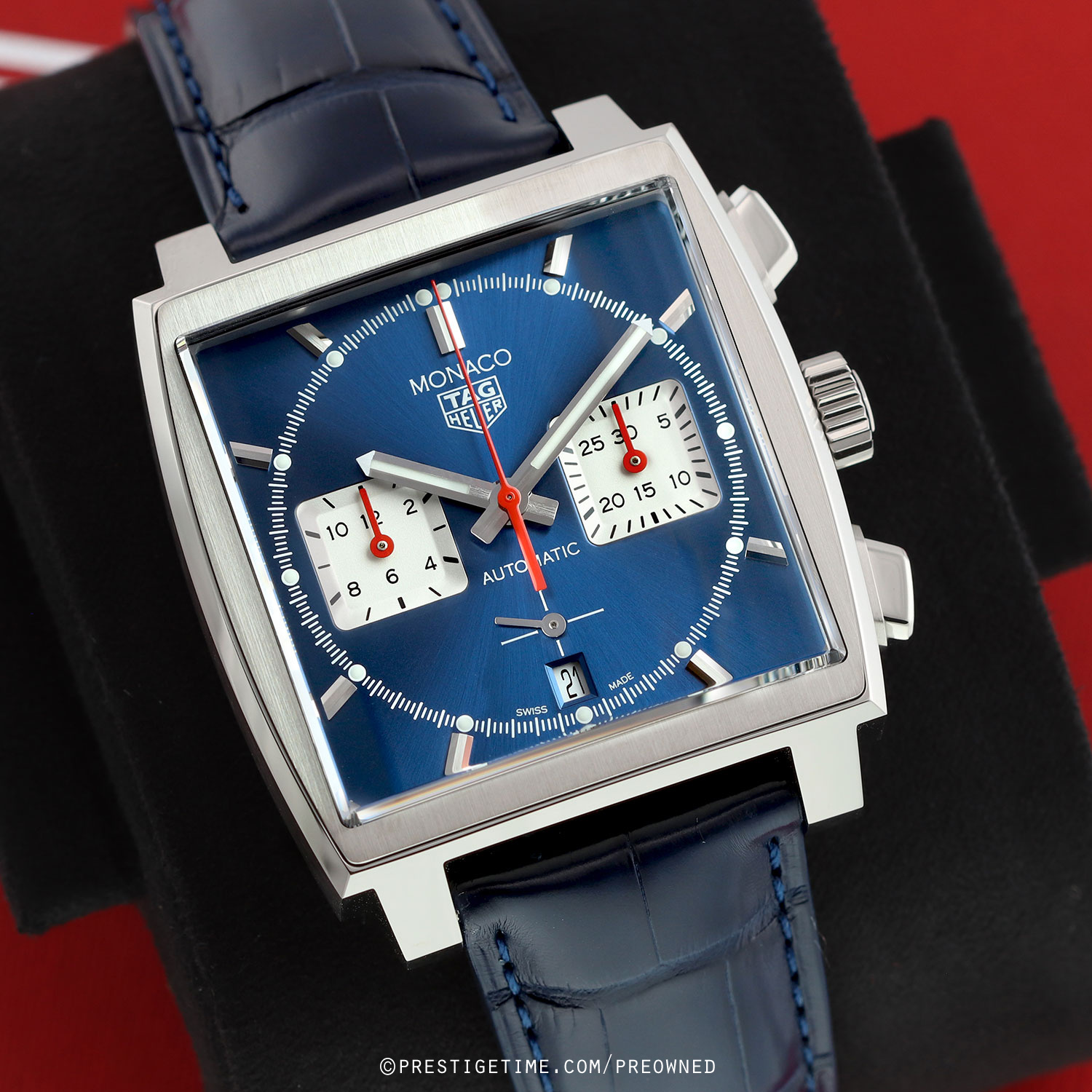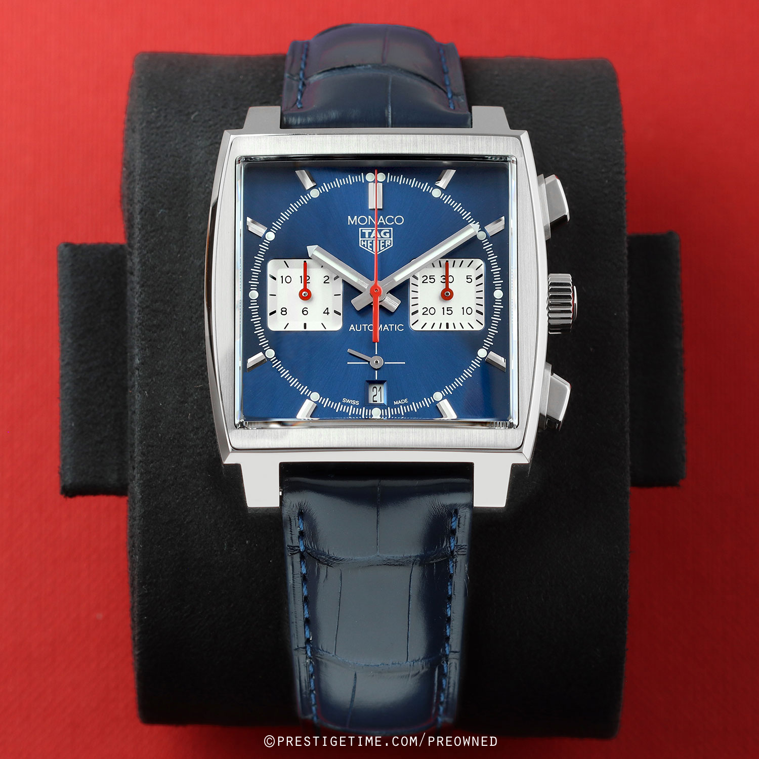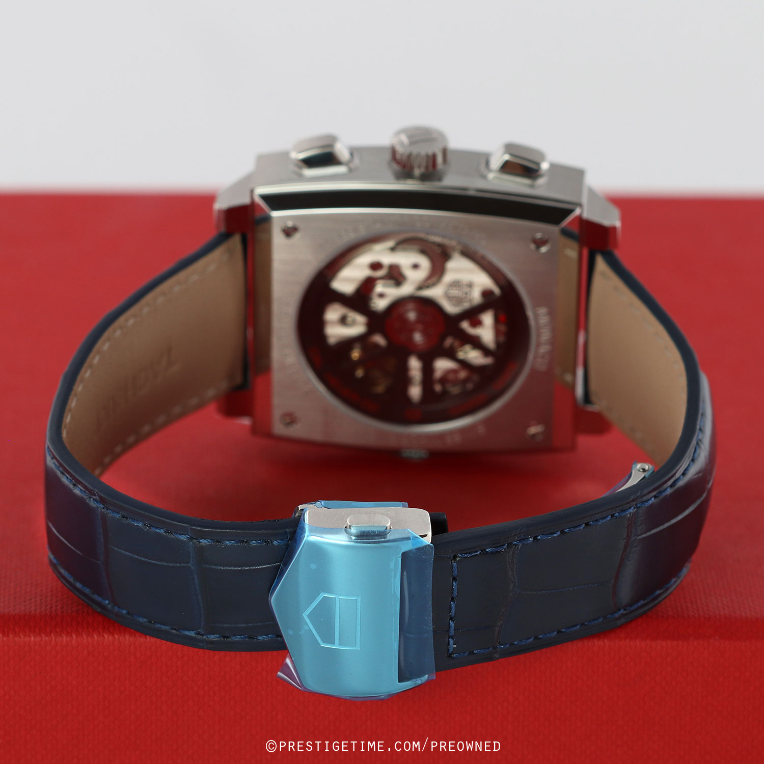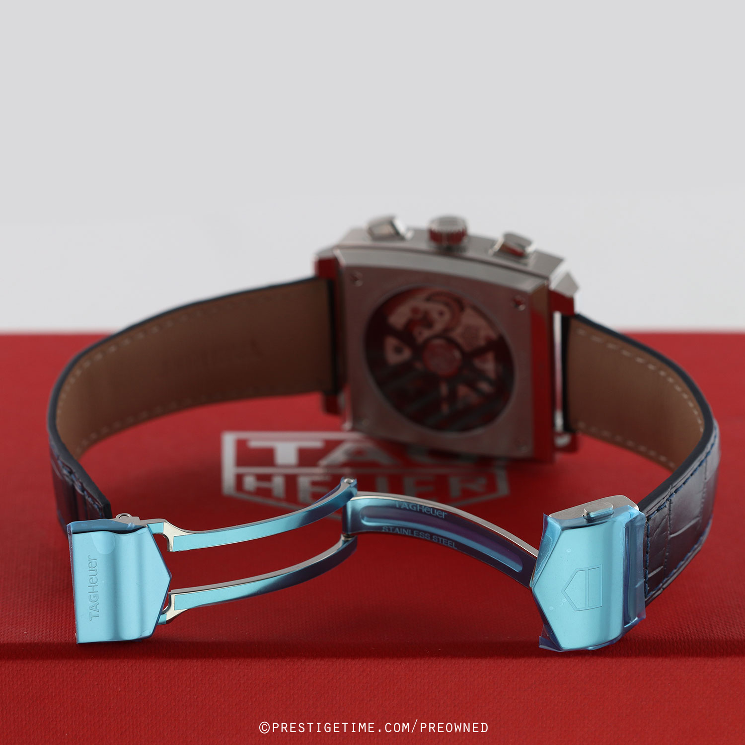 Strap: Fitted on its original TAG Heuer blue alligator leather strap with a push-button stainless steel deployant buckle. The strap is unworn in new condition with its full wear life-span remaining.