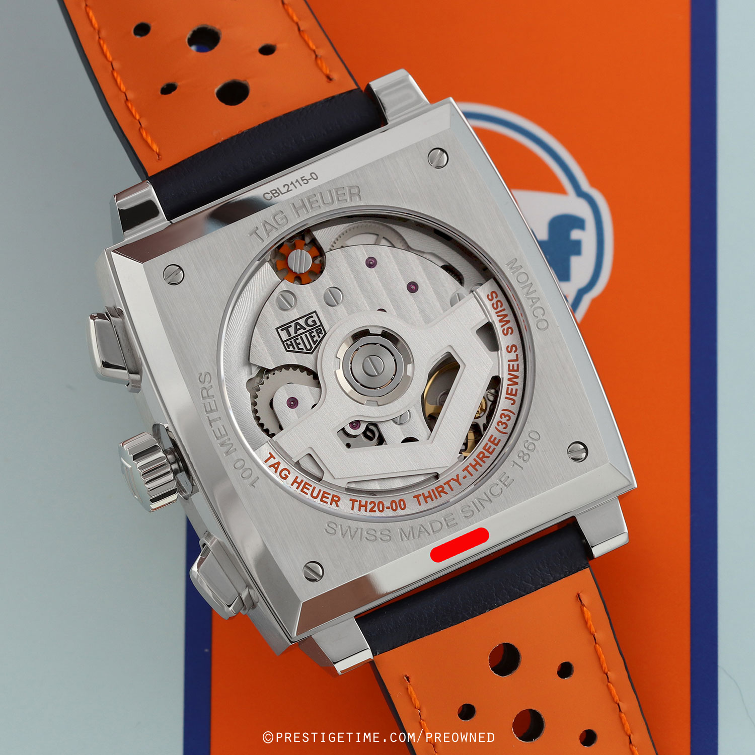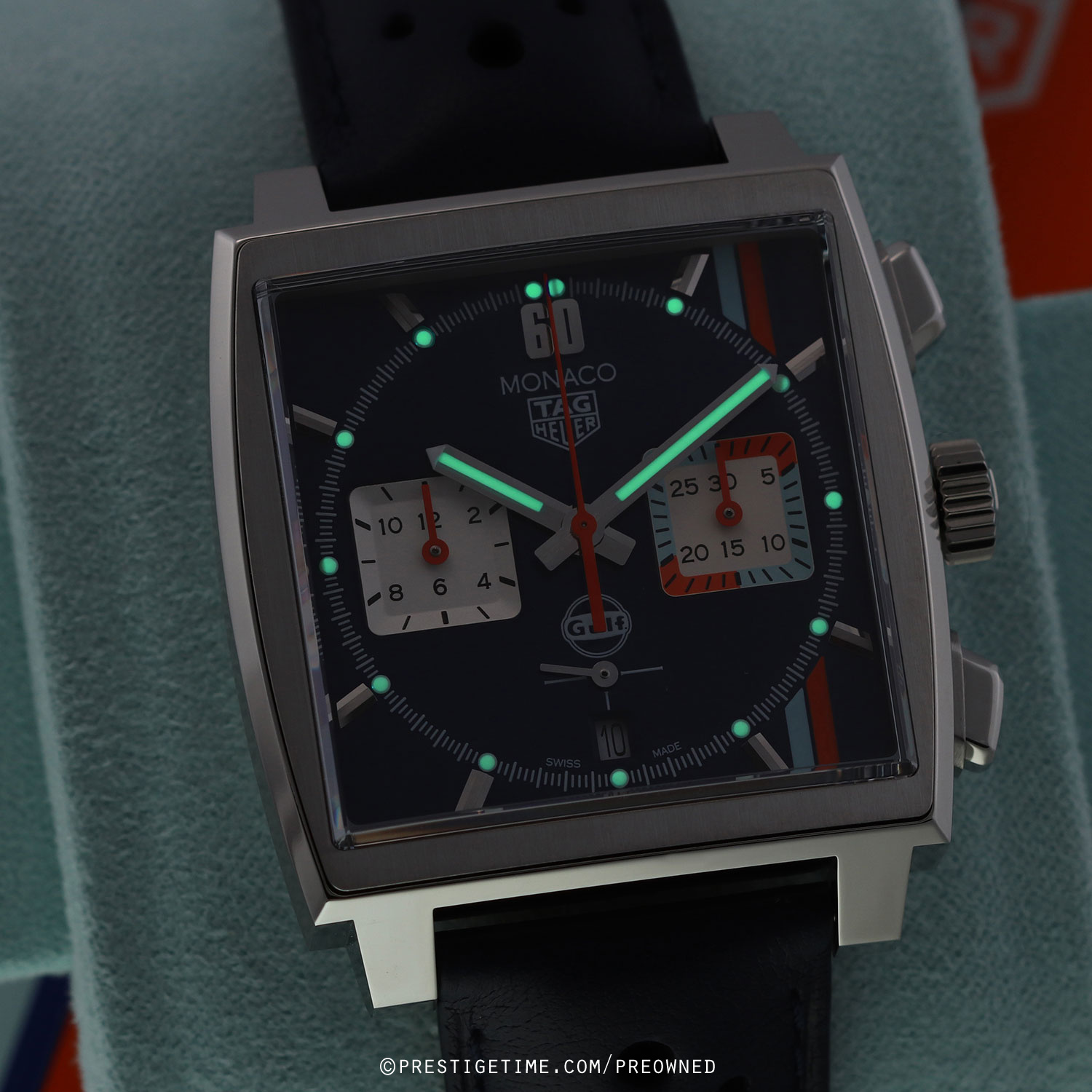TAG Heuer MONACO Gulf Automatic Chronograph. The dial features the co-branding of TAG Heuer & GULF logos & highlighted with the iconic light blue & orange colored stripes