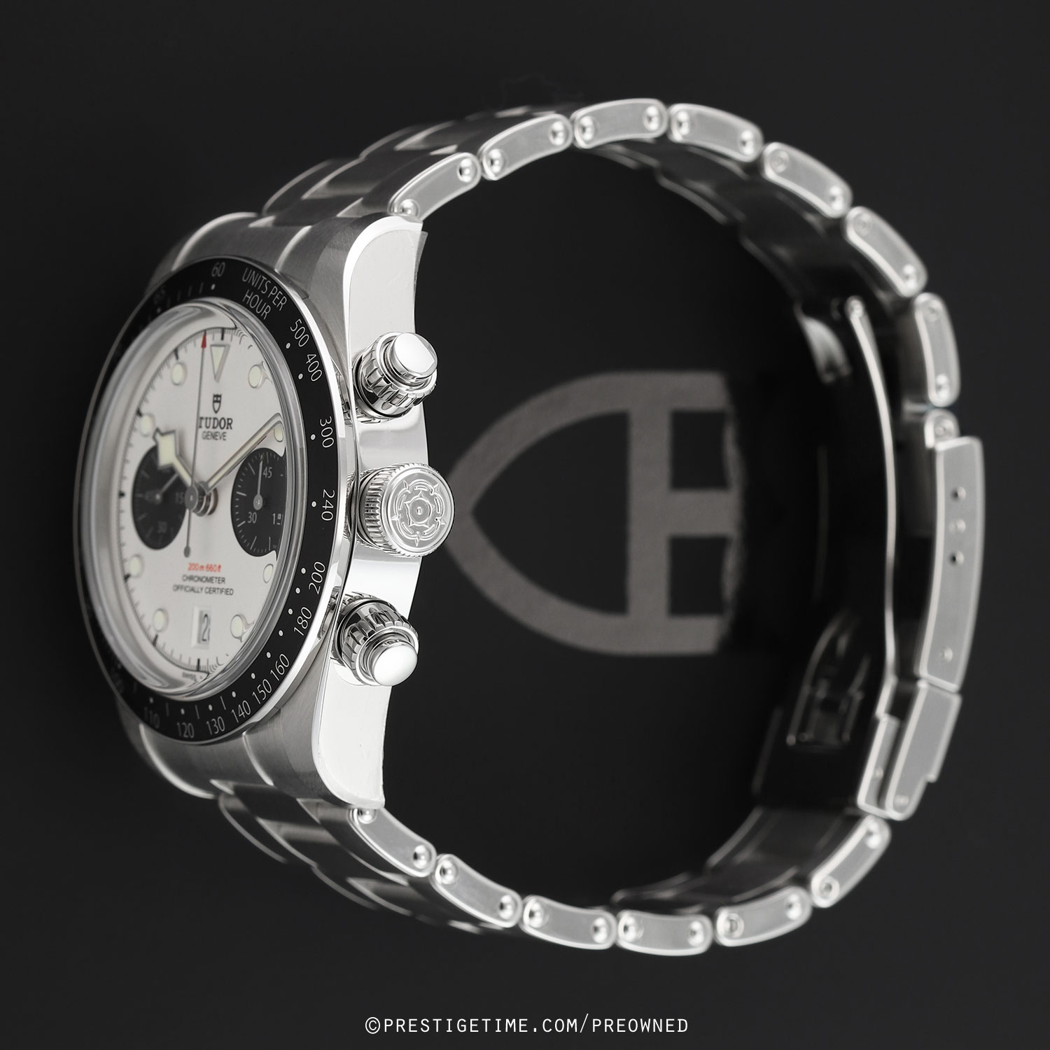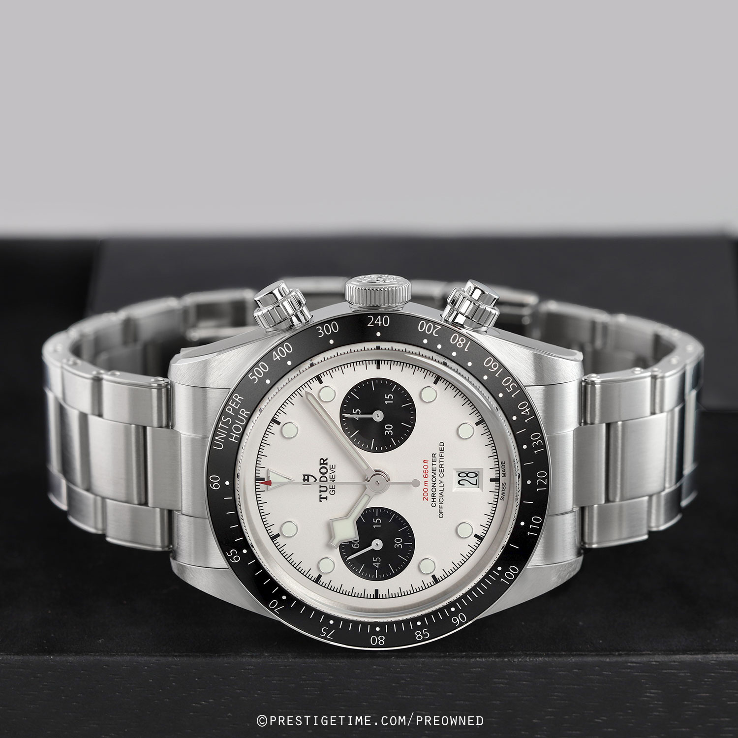 Case: Brushed & polished stainless steel case. Stainless steel bezel fixed position featuring a black aluminum bezel ring with a tachymeter scale. Silver-white dial with a fine matte finish. Black sub-dials. Polished hands, the 'Snowflake' style hour & minute hands with luminous fill. Applied polished hour markers with luminous fill. Fine printed minute/seconds & fractions of a seconds track. Small seconds sub-dial at 9 o'clock. Date window at 6 o'clock.