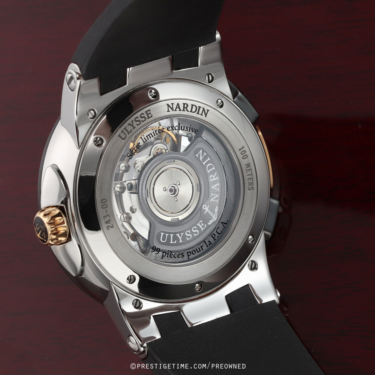 Movement: Powered by a Ulysse Nardin caliber UN-24 (base ETA 2892-a2), beats at 28,800 vph, contains 34 jewels & has a power reserve of +/- 42 hours.