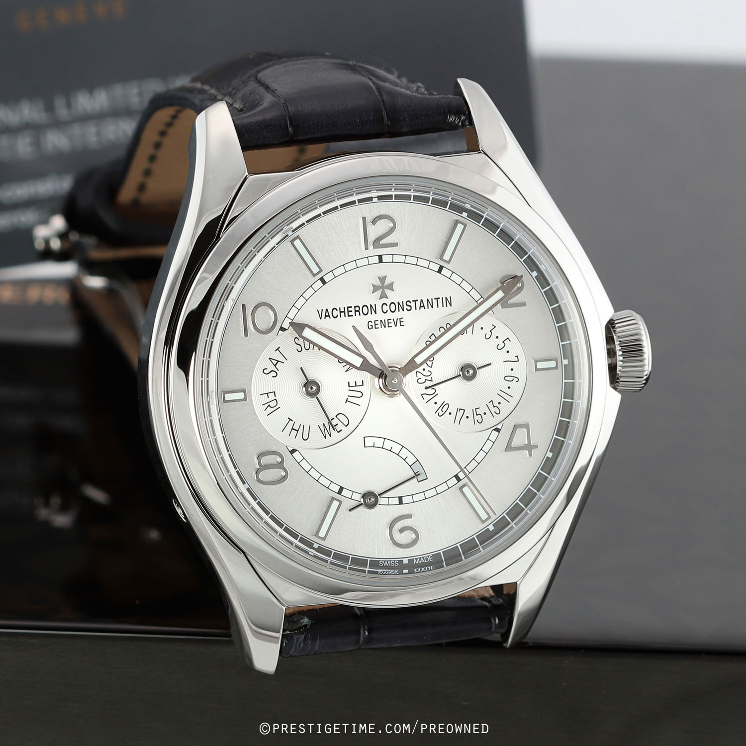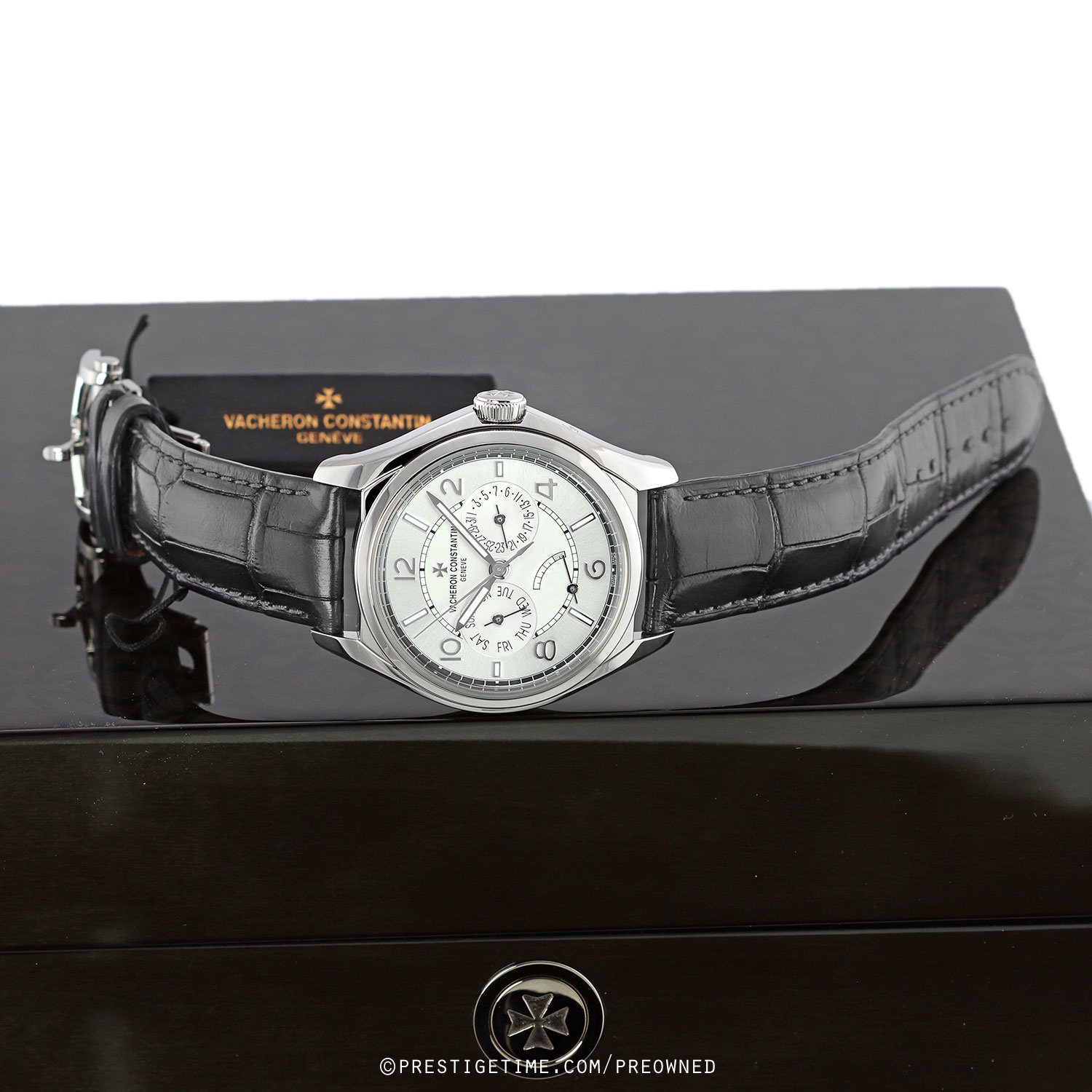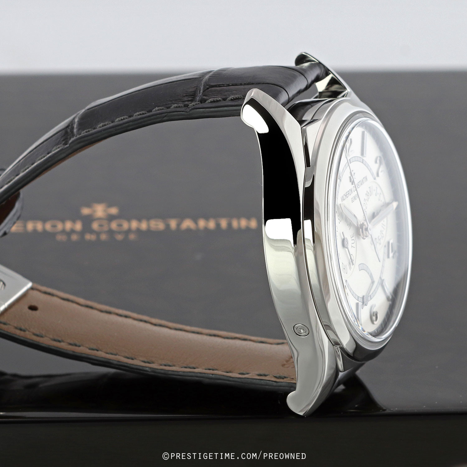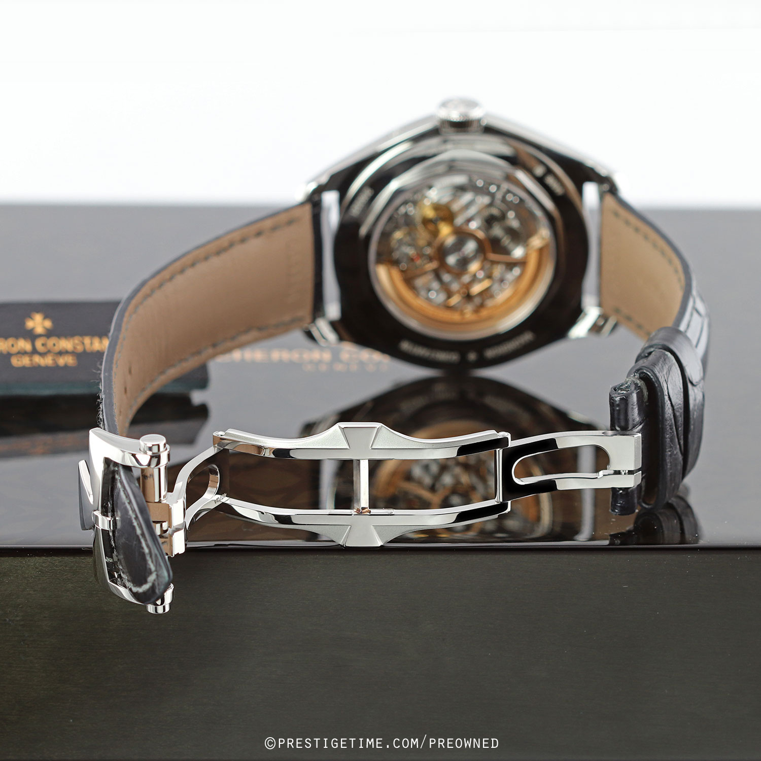 Strap: Fitted on its original Vacheron dark grey, almost black, alligator leather strap with a stainless steel push-button deployant buckle. The strap is in excellent condition with the majority of its wear lifespan remaining. We would be comfortable rating the strap as in 97%+ condition.