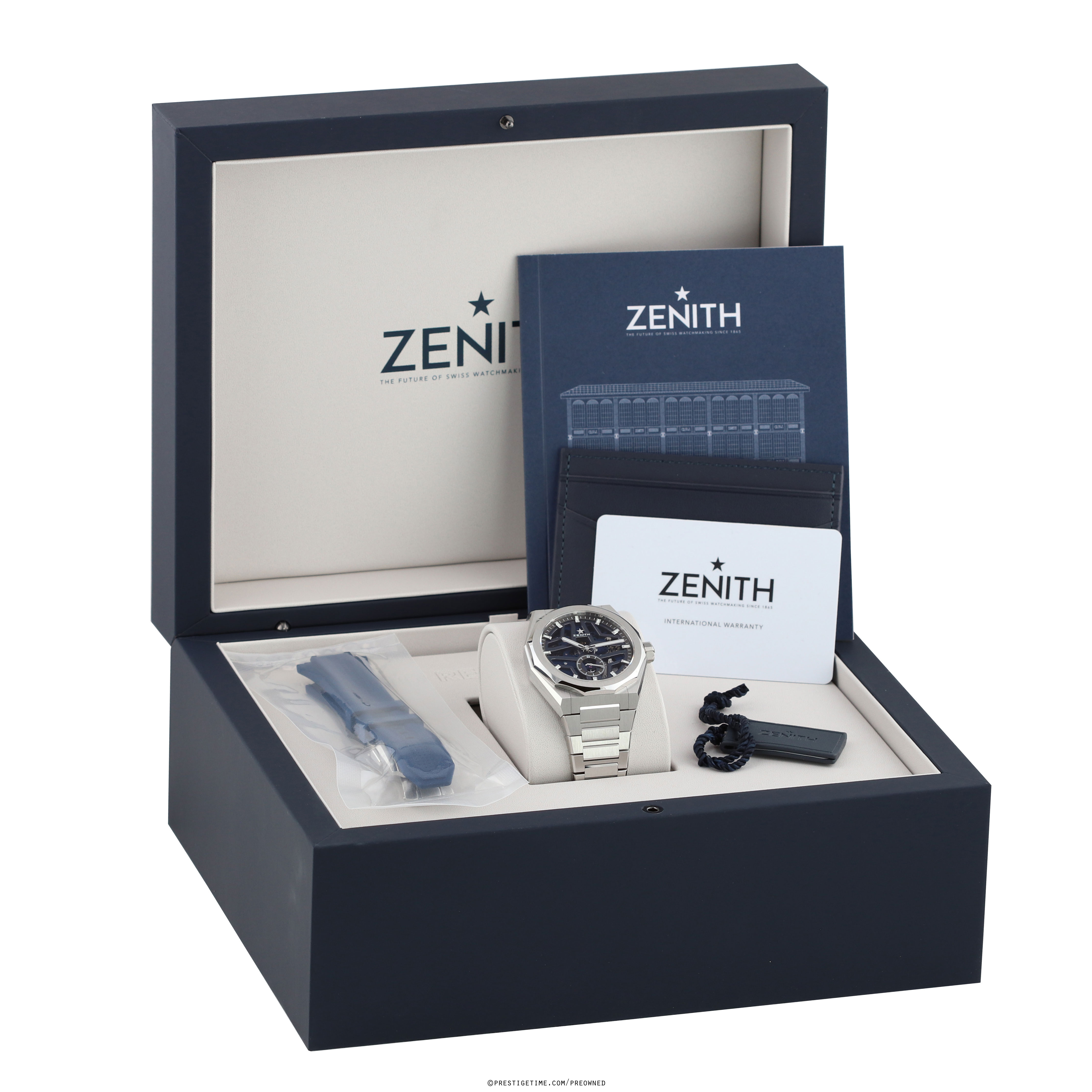 - Delivered with an additional original Zenith blue rubber strap with a stainless steel push-button deployant buckle. The strap is unworn, in brand new condition with its full wear lifespan remaining.