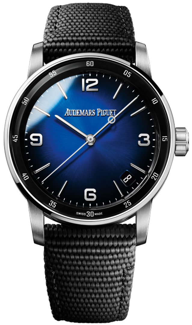 • Blue smoke-lacquered dial with a sunburst gradient effect.