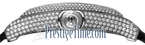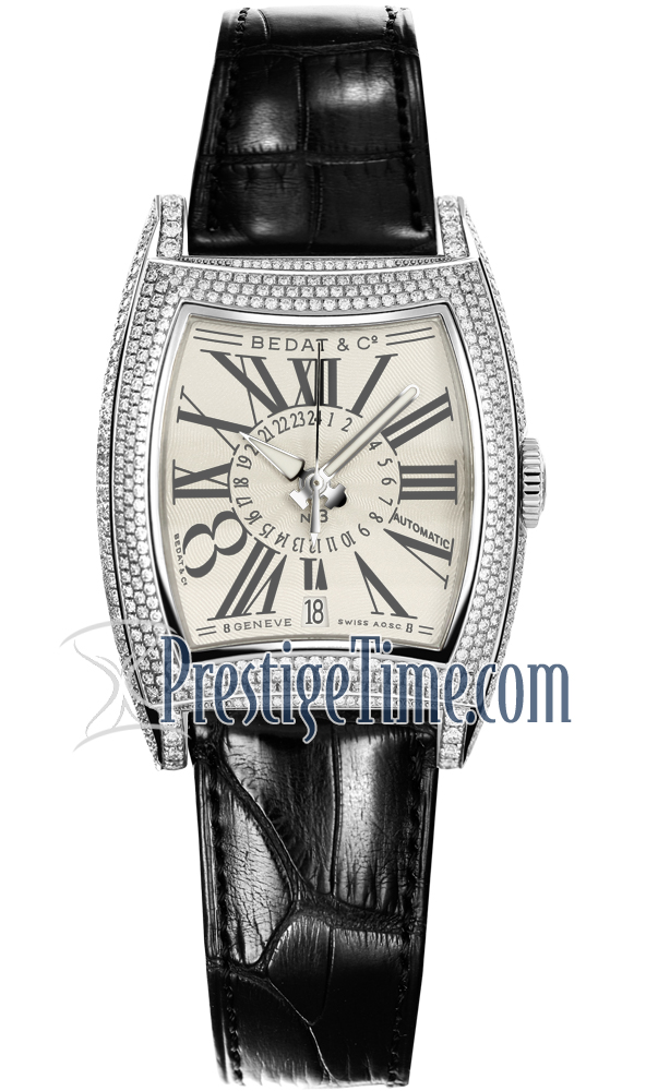 Stainless steel case, Black leather strap, Bezel and Case set with 582 brilliant-cut diamonds (Total carat weight: approx. 3.79), Silver textured dial with Anthracite Roman numerals, Displays date at 6, 24-hours central counter with Arabic numerals and an arrow-type hand, Automatic Movement, Approximately 46-hours power reserve.