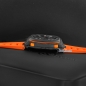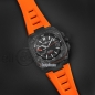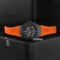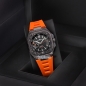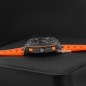 • Orange openworked rubber strap with DLC coated steel folding buckle.