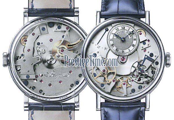 • The rest of the dial is is completely exposed displaying the finely finished movement of the watch. Some of the immediately recognizable Breguet innovations. Also visible is the "pare-chute" escapement which protects the balance pivot - a delicate/fragile component - from breaking due to shock (such as a drop or a minor knock). The pare-chute allows for a smaller & differently shaped pivot which is mounted on a spring plate which in turn allows room for play - thus protecting this crucial pivot from breaking.