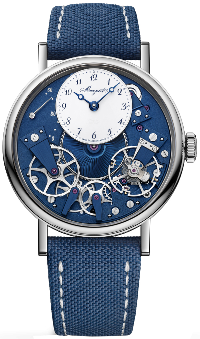 Dial: white & blue - polished, offset grand feu enamel dial at the 12 o'clock position. exposed blued mainplate & bridges with a fine textured finish.