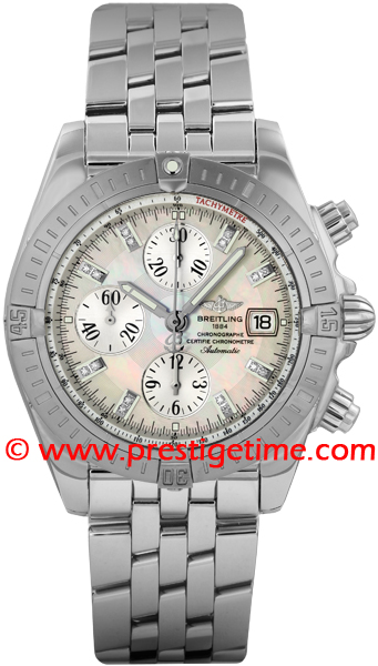 Mother of Pearl Dial with Silver subdials. Diamond set hour markers, Luminous hands. This watch Features: 1/4th of a second Chronograph & a Tachymeter Scale. Date Displayed at the 3 o'clock position.