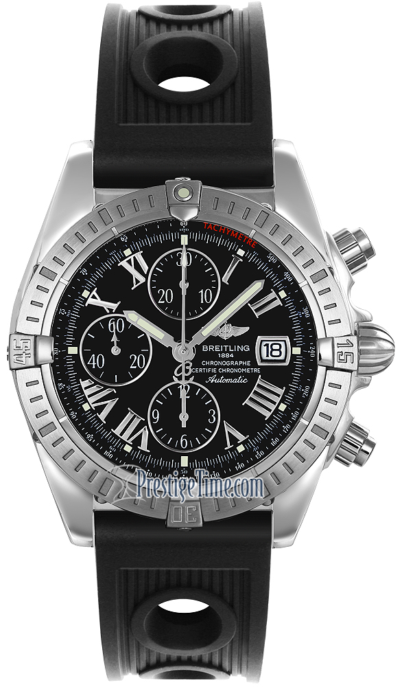 Black Dial with Black Sub-Dials, Roman Numeral, Luminous hands. This watch Features: 1/4th of a second Chronograph & a Tachymeter Scale. Date Displayed at the 3 o'clock position.
