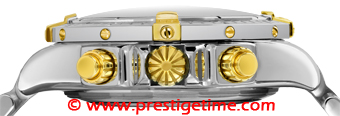 Silver Dial with Gold/Champagne colored Sub-Dials. Gold-Tone Index hour markers & hands. This watch Features: 1/4th of a second Chronograph & a Tachymeter Scale. Date Displayed at the 3 o'clock position.