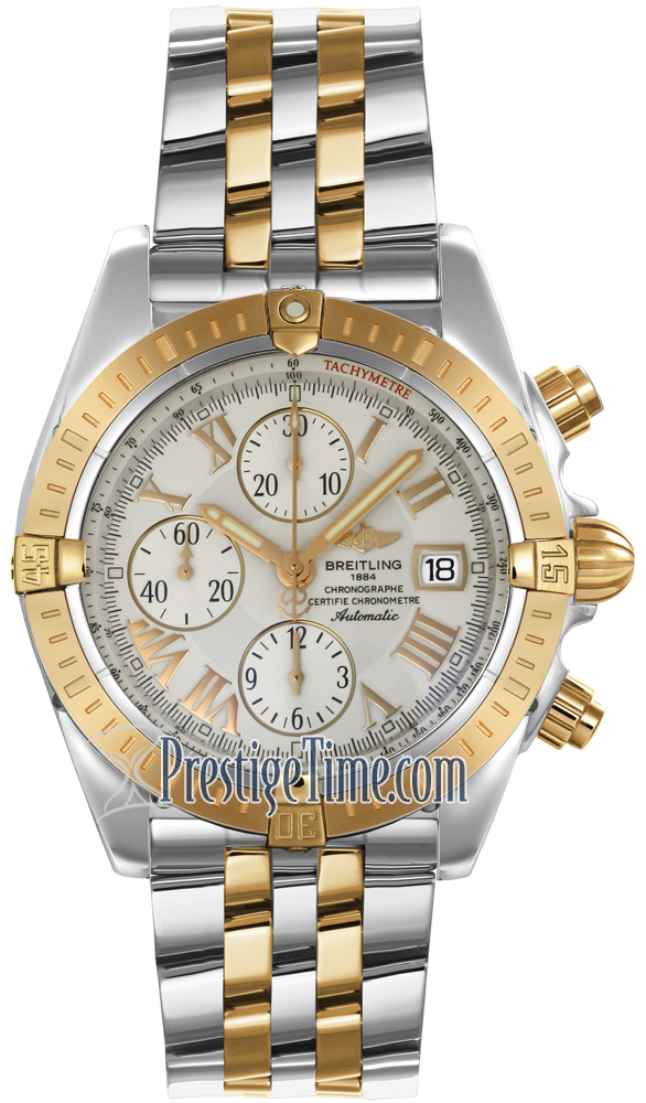 18KT Rose gold and steel, Ivory Dial with silver colored Sub-Dials. Gold-Tone Roman Numeral hour markers & hands. This watch Features: 1/4th of a second Chronograph & a Tachymeter Scale. Date Displayed at the 3 o'clock position.