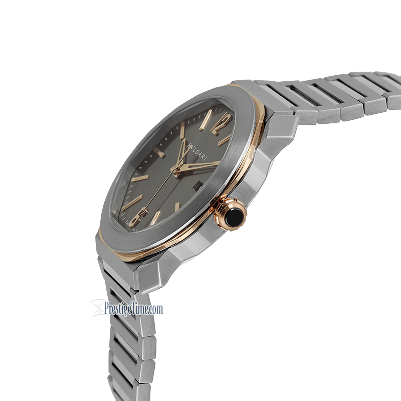 • Fixed octagonal shaped rose gold and steel bezel with brushed stainless steel bezel ring.