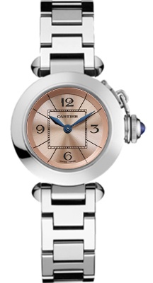 • Steel screw-down crown decorated with a pink synthetic spinel cabochon