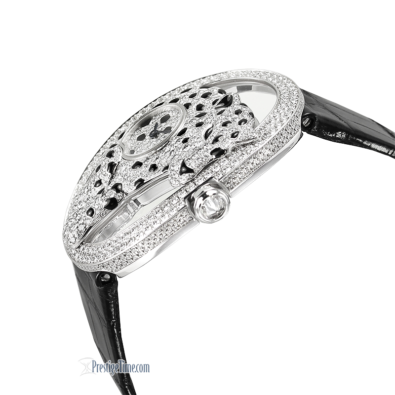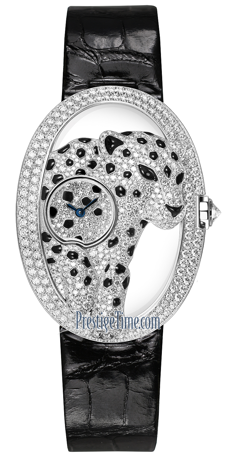 Cartier HPI00656 Panthere Ajouree de Cartier watch, Manufacture manual winding mechanical movement, caliber 8971 MC. Rhodiumized 18kt white gold case set with 618 brilliant-cut diamonds totaling 3.27 carats, enamel spots, 12-sided crown set with a brilliant-cut diamond, rhodiumized 18K white gold dial set with 92 diamonds totaling 0.16 carats, enamel spots, blued-steel sword-shaped hands, white semi-matte alligator skin strap, 14 mm double adjustable folding rhodiumized 18kt white gold buckle set with 38 brilliant-cut diamonds totaling 0.37 carats
