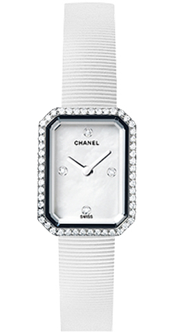 • White mother-of-pearl dial with four diamond hour markers and steel hands.