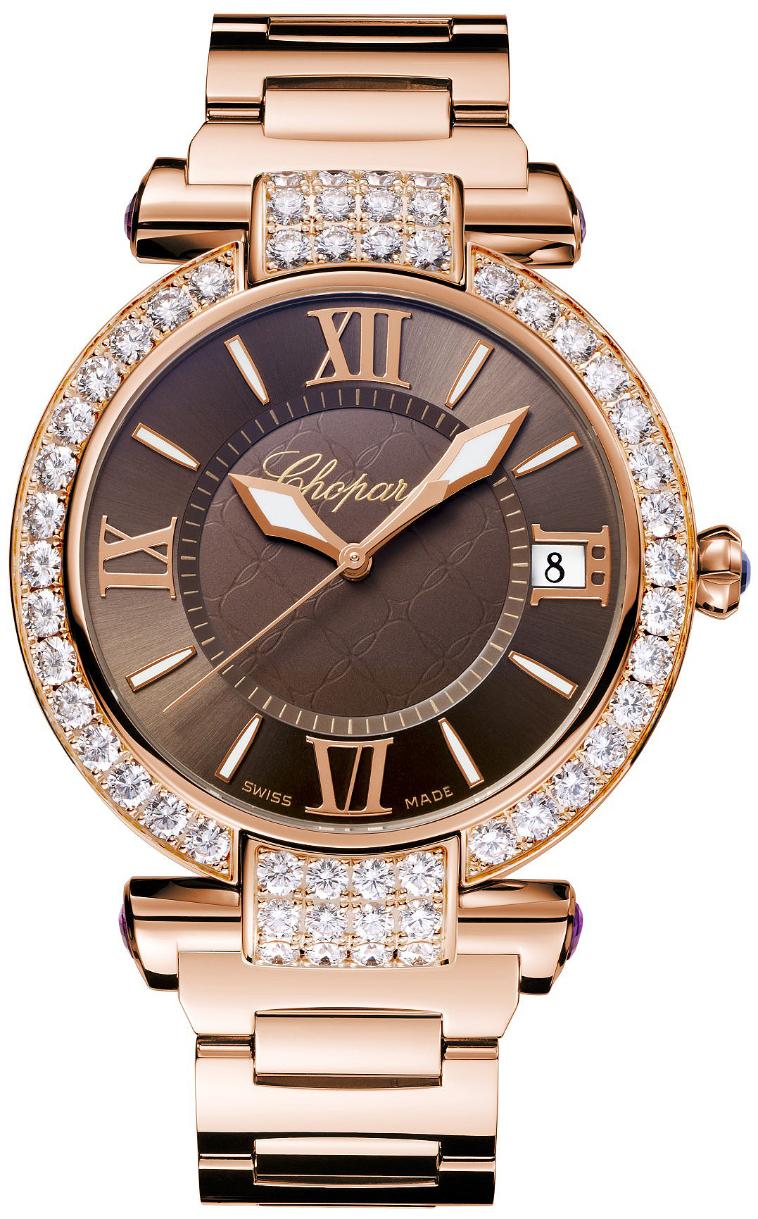 • Solid polished 18kt rose gold case, lugs, and bracelet.
