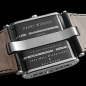 • Linear display of hours and minutes, replaces traditional hands, time is displayed by two parallel diamond chains, for hours and minutes. Sleek and scintillating, each chain is adorned with 33 baguette-cut diamonds (total of 66 diamonds weighing a total of +/- 2.148 carts). Vivid red garnets are strategically positioned to indicate the hours and minutes (total of 6 garnets weighing a total of +/- 0.222 carts).