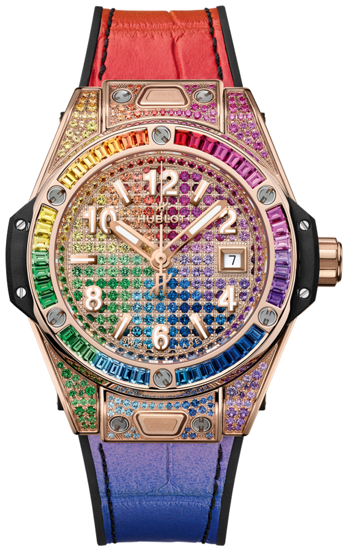 Case: 18kt king gold - polished, set with 130 colored gemstones: rubies, pink sapphires, amethysts, blue sapphires, blue topazes, tsavorites, yellow and orange sapphires.