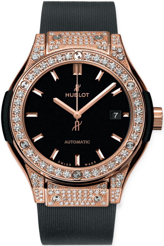 • Polished 18kt King Gold (rose gold) crown engraved with the Hublot logo.