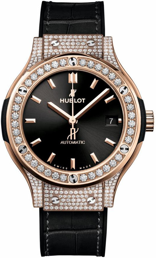 • Bezel secured with 6 polished "H" style titanium screws.Solid polished 18kt rose gold crown engraved with the Hublot logo.