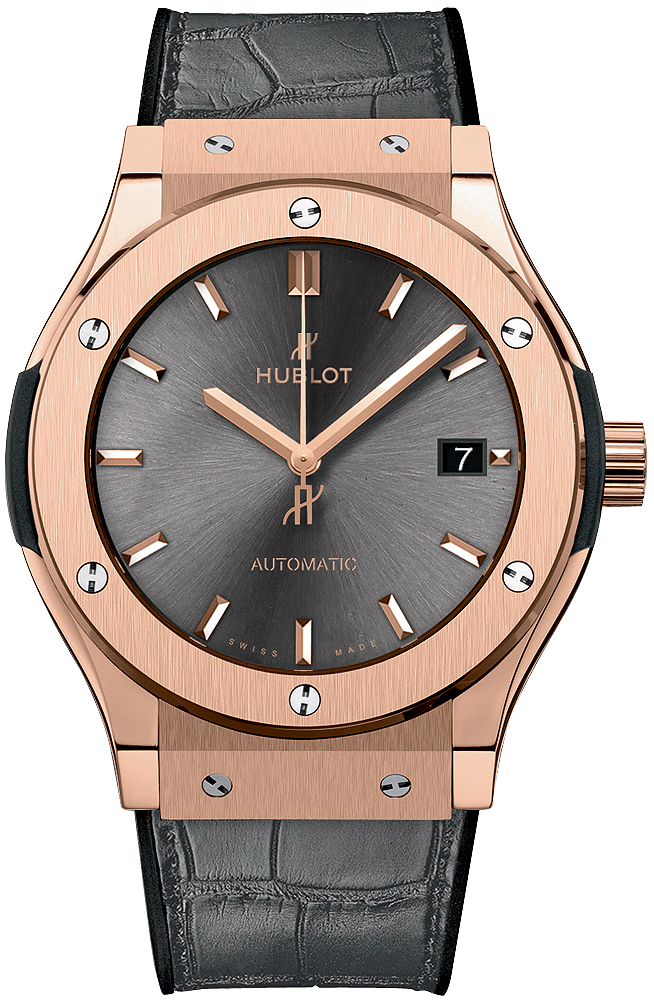 • Solid polished 18kt rose gold crown engraved with the Hublot logo.
