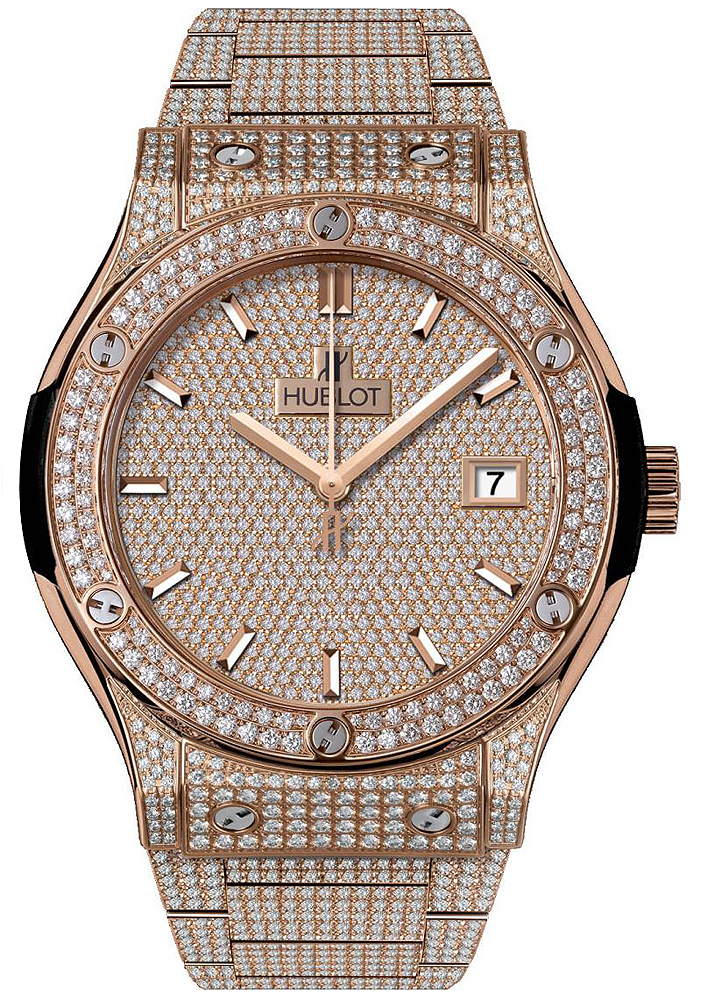 • Solid polished 18kt rose gold crown engraved with the Hublot logo.