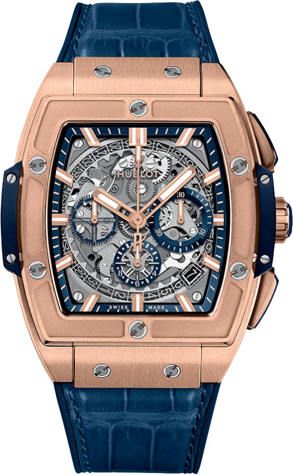 • Brushed & polished gold crown & chrono buttons with blue insert.