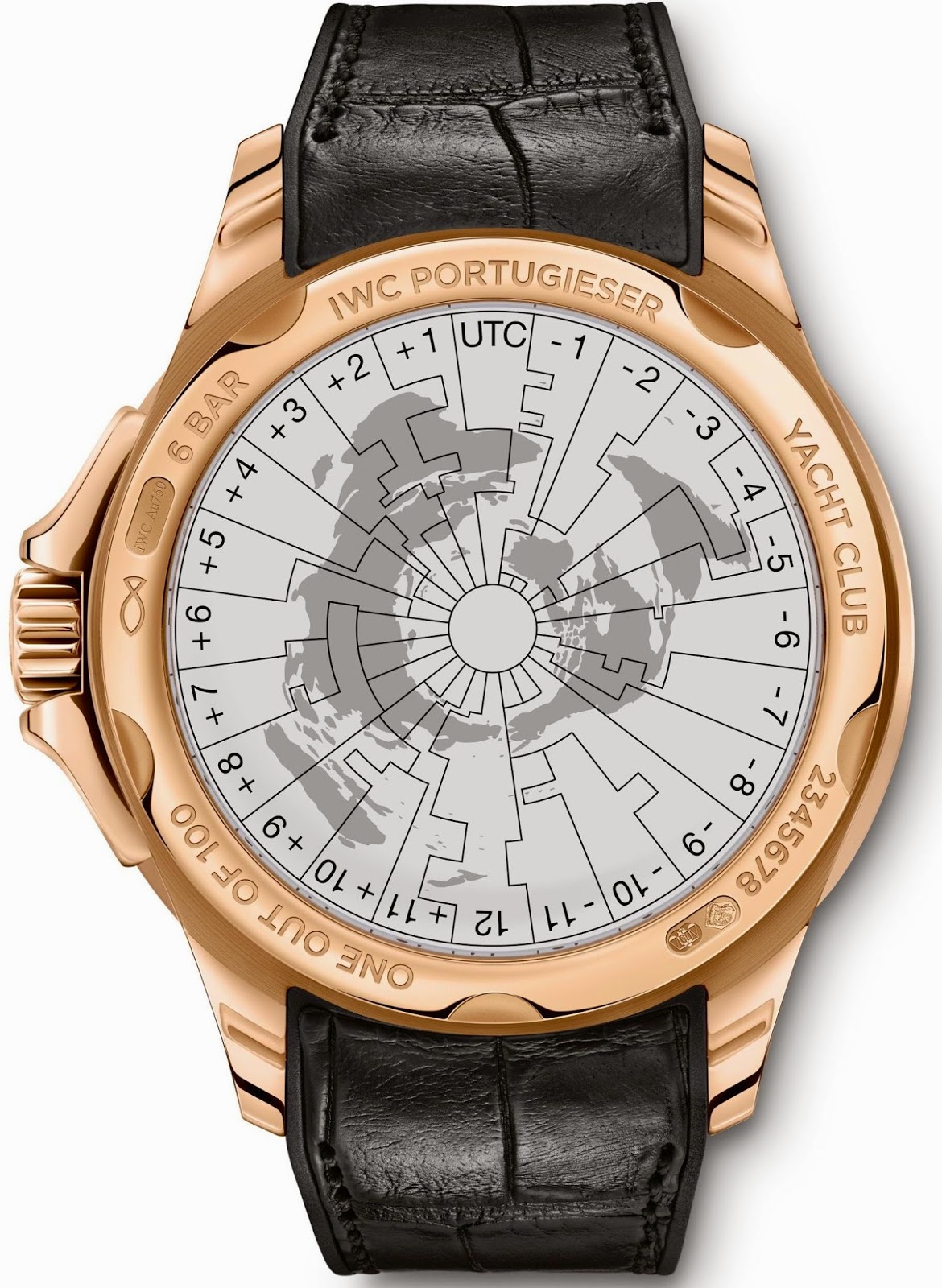• Glass disc printed with a map of the globe & timezones, set into the case back