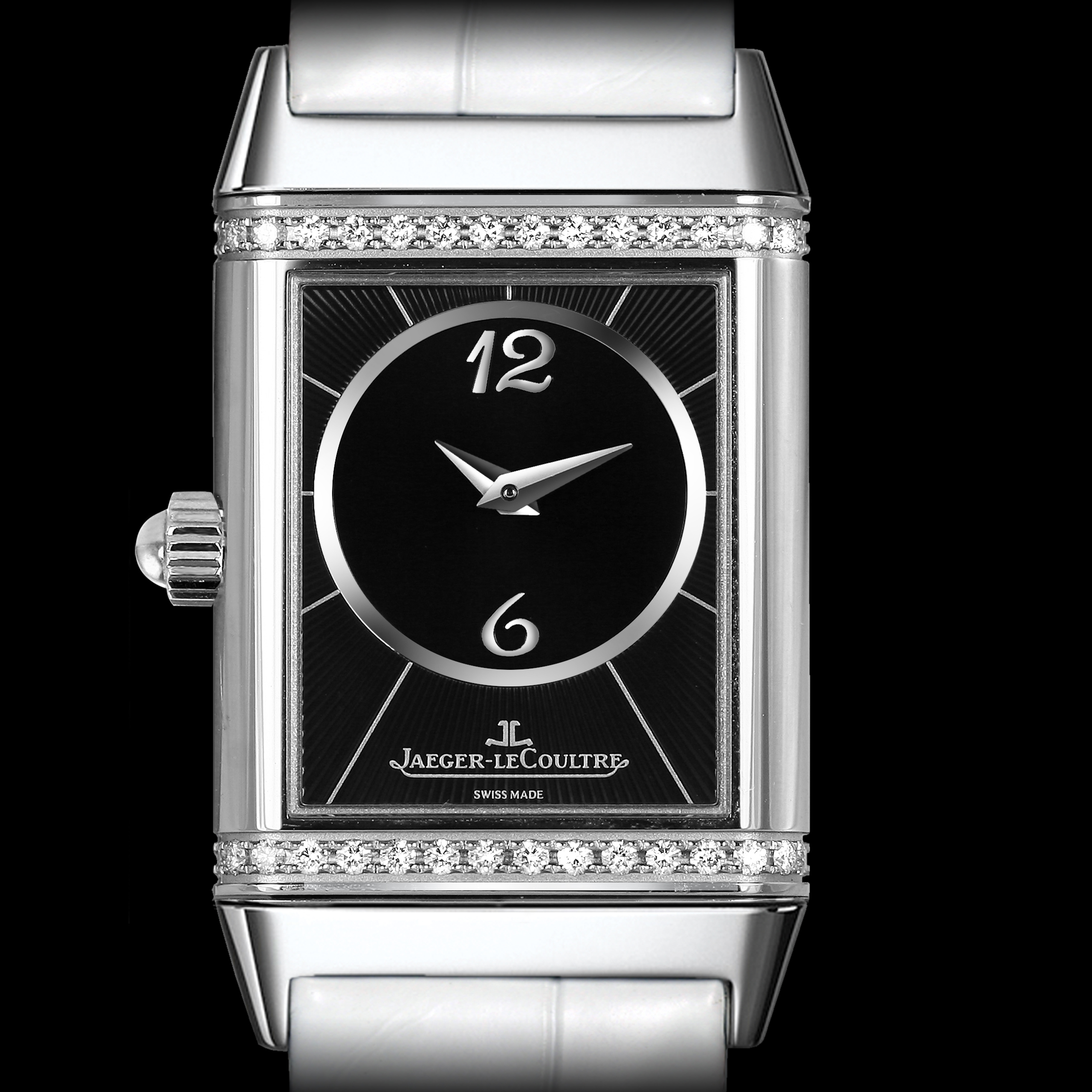 New Design dials! On the front is a Silvered dial with Florale Arabic Hour Numerals. On the Reverside is a Black dial enhanced by a row of diamonds on top & bottom - diamonds are "Top Wesselton" Quality F-G Color & total Weight. White Leather Strap. Please note the watch keeps only 1 timezone (same on either side).